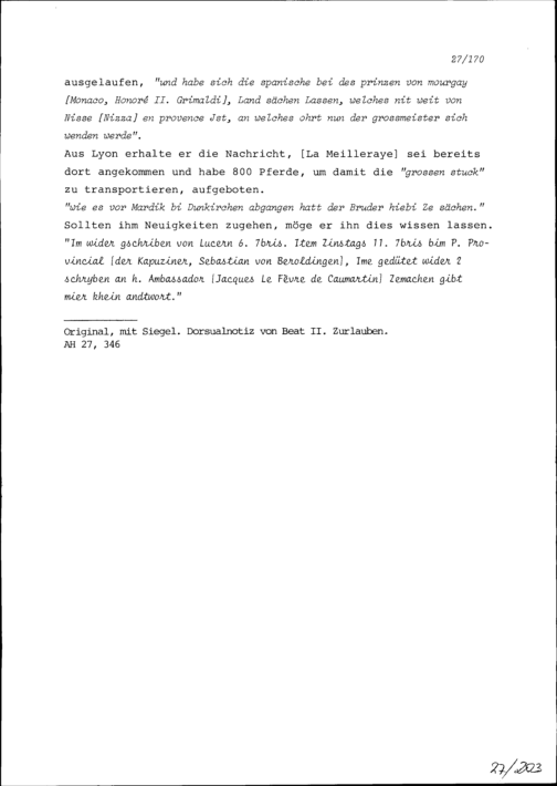 Schreiben von Wolfgang Dietrich Theodor Reding an Beat II. Zurlauben, Ammann, Luzern oder Zug