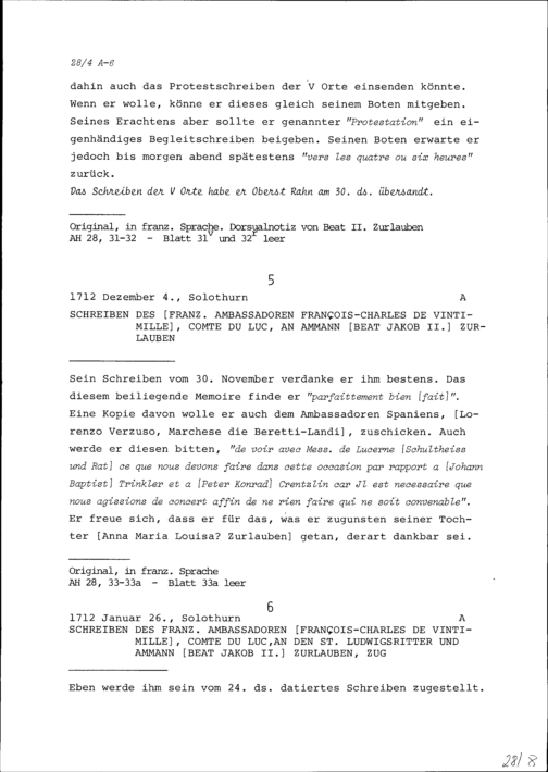Schreiben von François-Charles de Vintimille, Graf du Luc, Ambassador von Frankreich, an Beat Jakob II. Zurlauben, Ammann