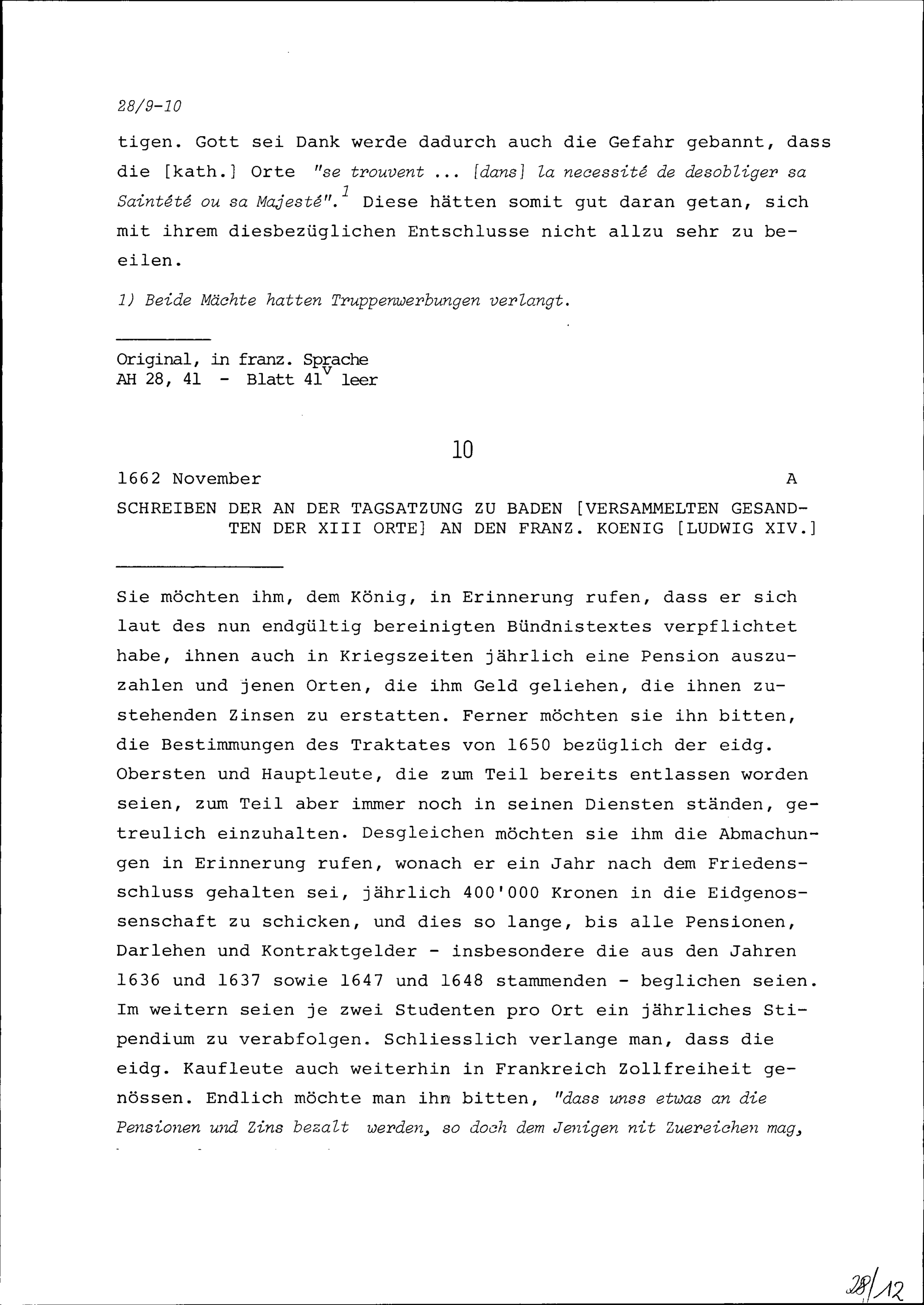 Schreiben der Tagsatzungsgesandten der Dreizehn Orte in Baden an Ludwig XIV., König von Frankreich