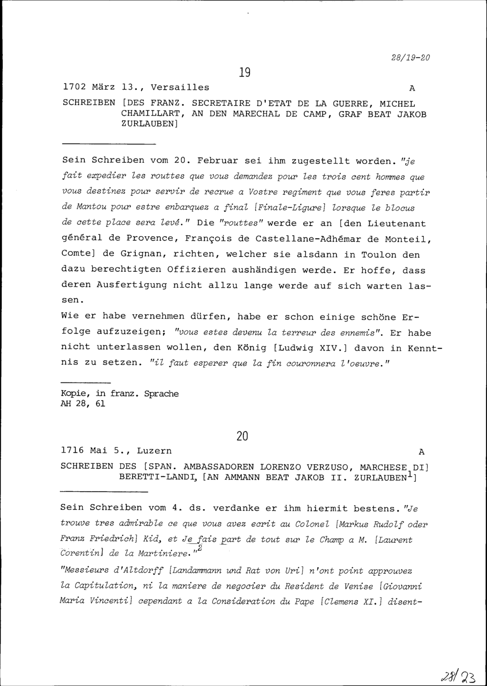 Schreiben von Michel Chamillart, französischer Staatskriegsminister, an Beat Jakob Zurlauben, Feldmarschall