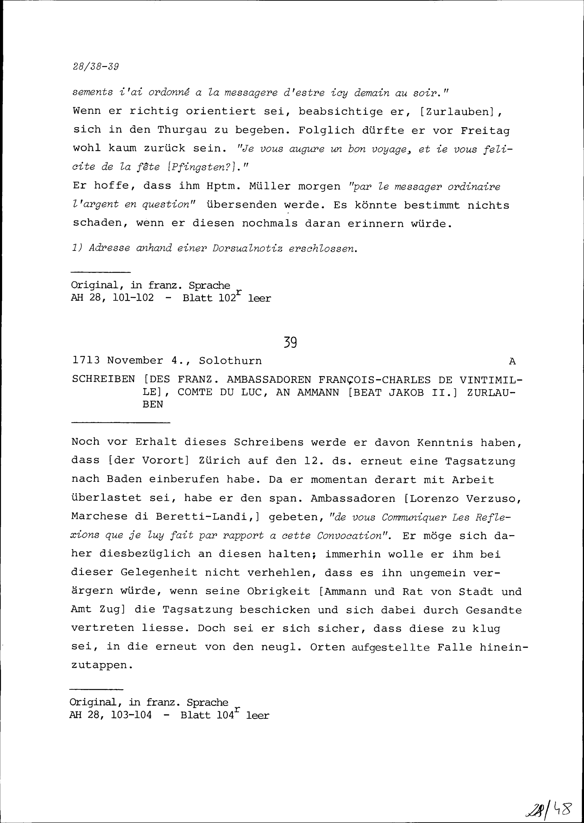 Schreiben von François-Charles de Vintimille, Graf du Luc, Ambassador von Frankreich, an Beat Jakob II. Zurlauben, Ammann