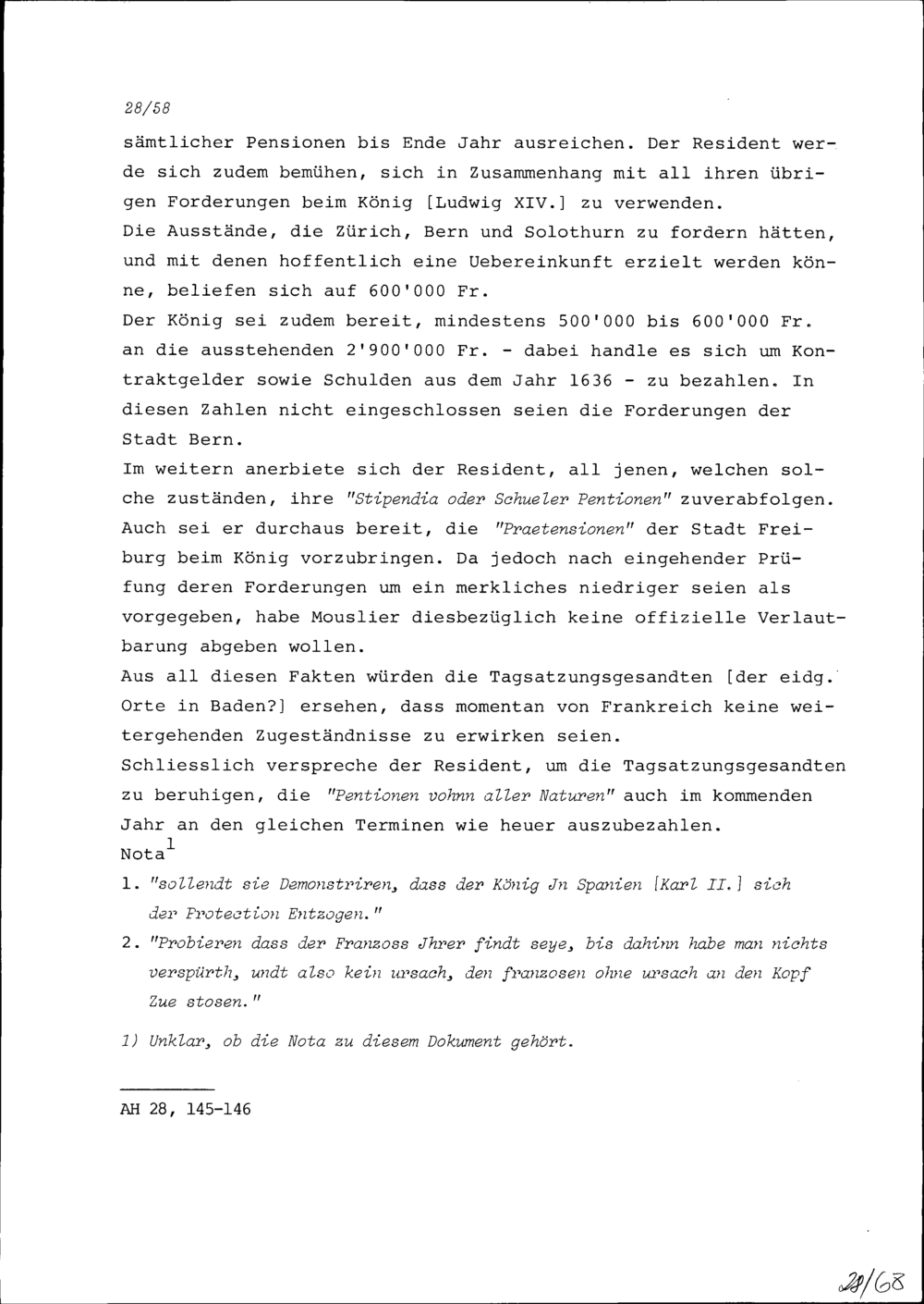 Aufzeichnungen über die Bemühungen von François Mouslier, Resident von Frankreich, die finanziellen Forderungen der Eidgenössischen Orte zu erfüllen