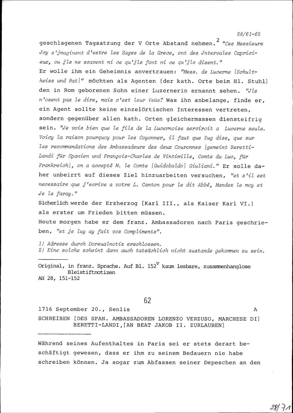 Schreiben von Lorenzo Verzuso, Marchese di Beretti-Landi, Ambassador von Spanien, an Beat Jakob II. Zurlauben