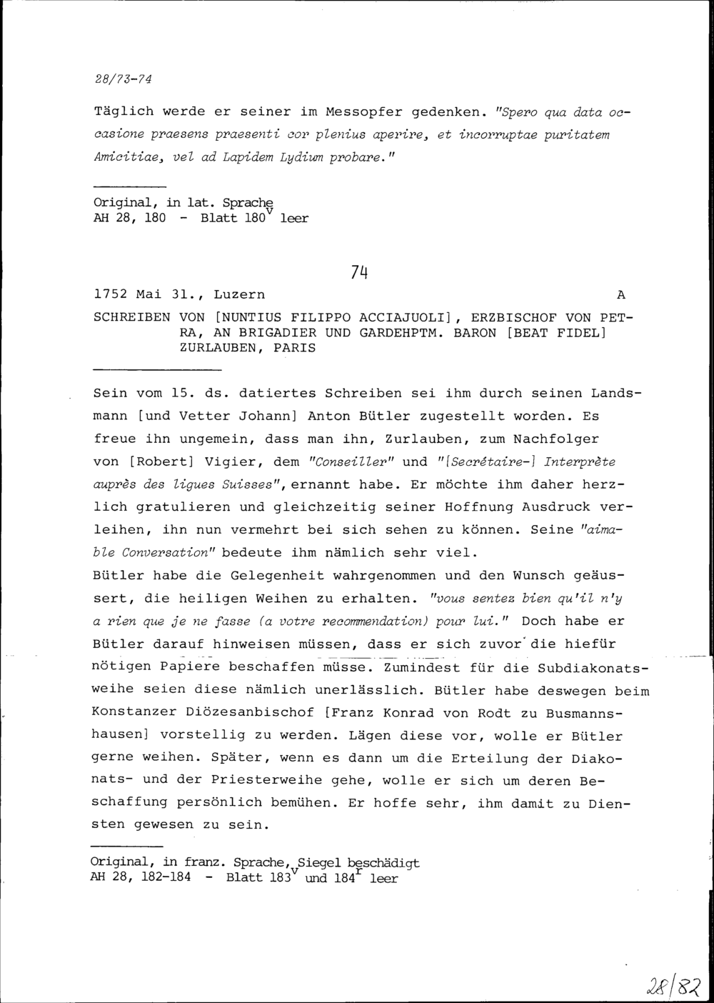Schreiben von Filippo Acciaiuoli, Nuntius und Erzbischof von Petra, an Beat Fidel Zurlauben, Brigadier und Gardehauptmann, Paris