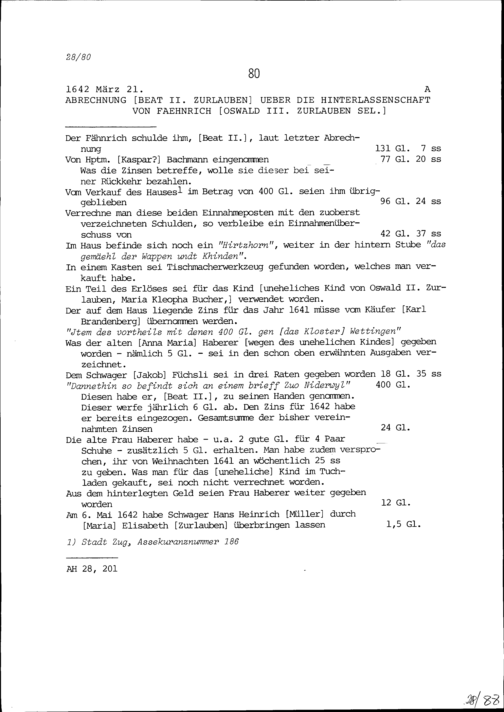 Abrechnung von Beat II. Zurlauben über die Hinterlassenschaft von Oswald III. Zurlauben, selig, Fähnrich