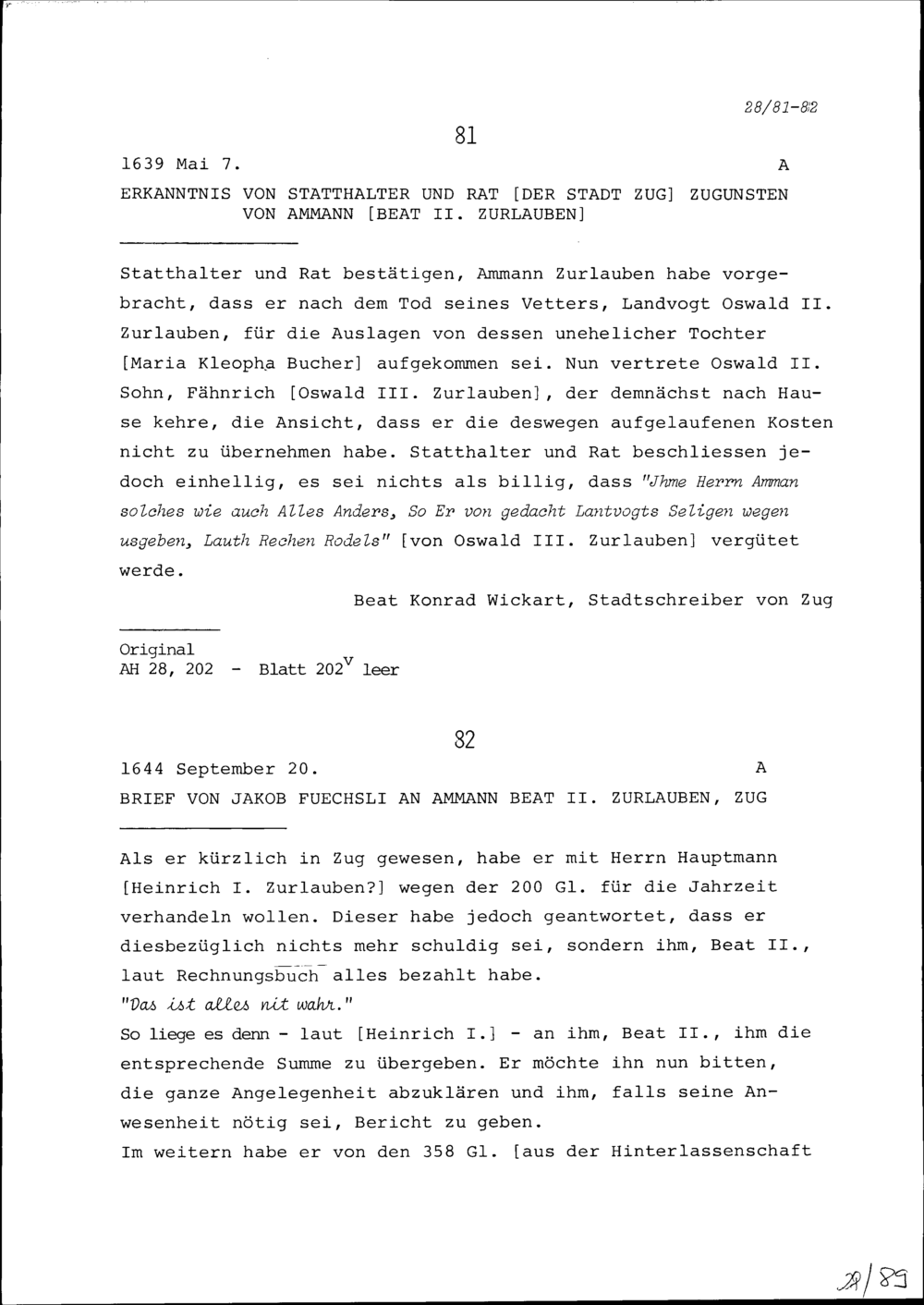 Beschluss des Statthalters und Rats der Stadt Zug zugunsten von Beat II. Zurlauben,...