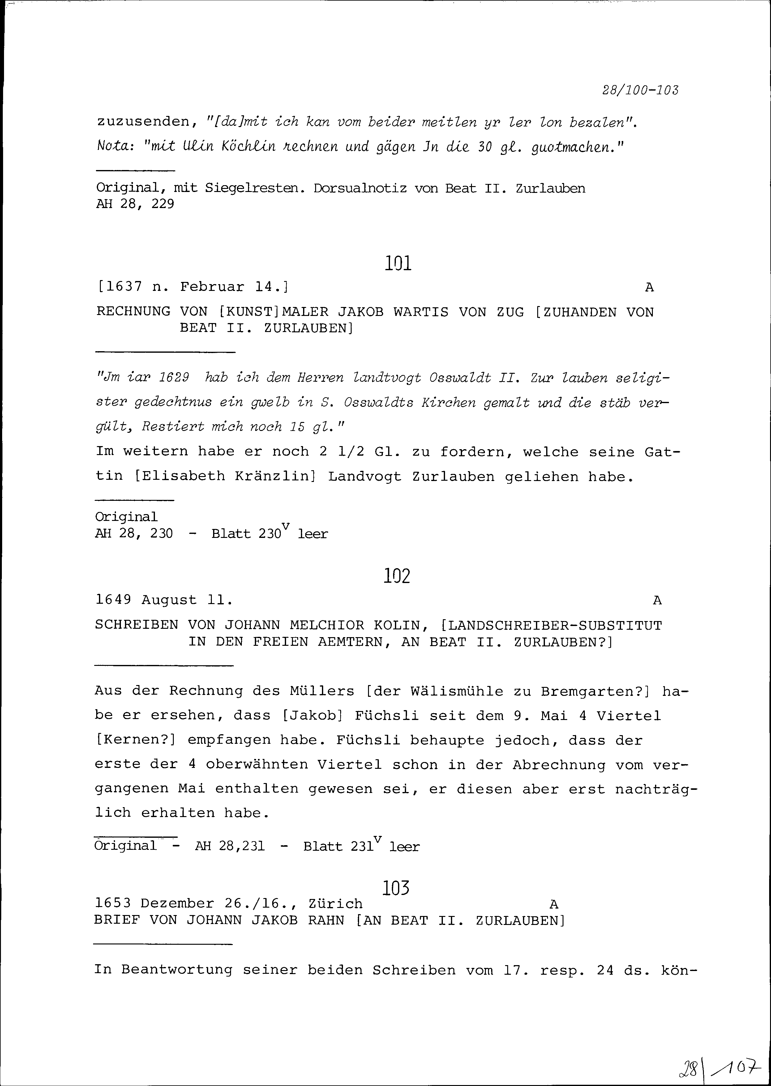 Rechnung von Jakob Wartis, Kunstmaler, Zug, zuhanden von Beat II. Zurlauben