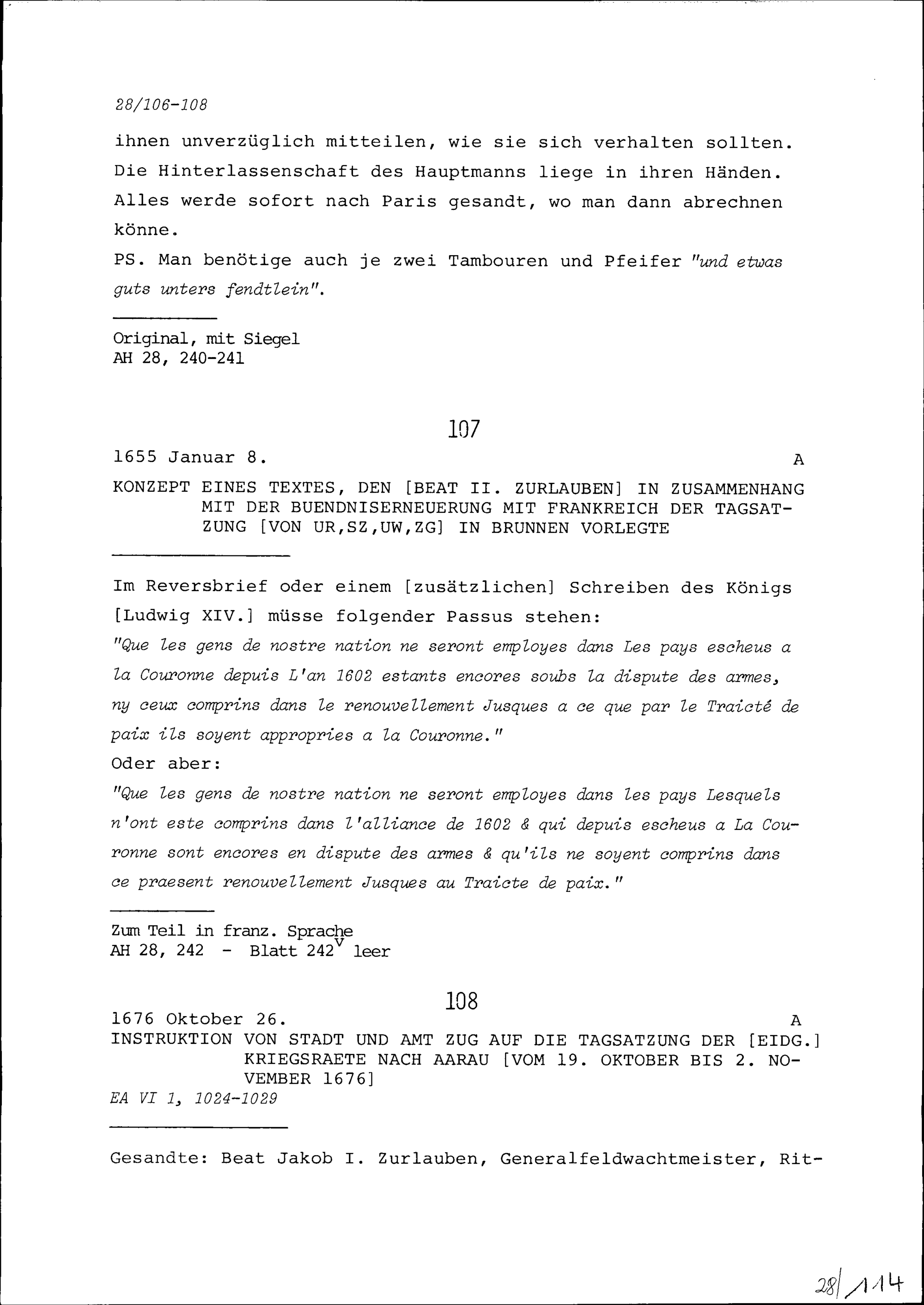 Bericht von Beat II. Zurlauben in Zusammenhang mit der Bündniserneuerung mit Frankreich, vorlegt an der Tagsatzung von Uri, Schwyz, Unterwalden (Ob- und Nidwalden) und Zug in Brunnen