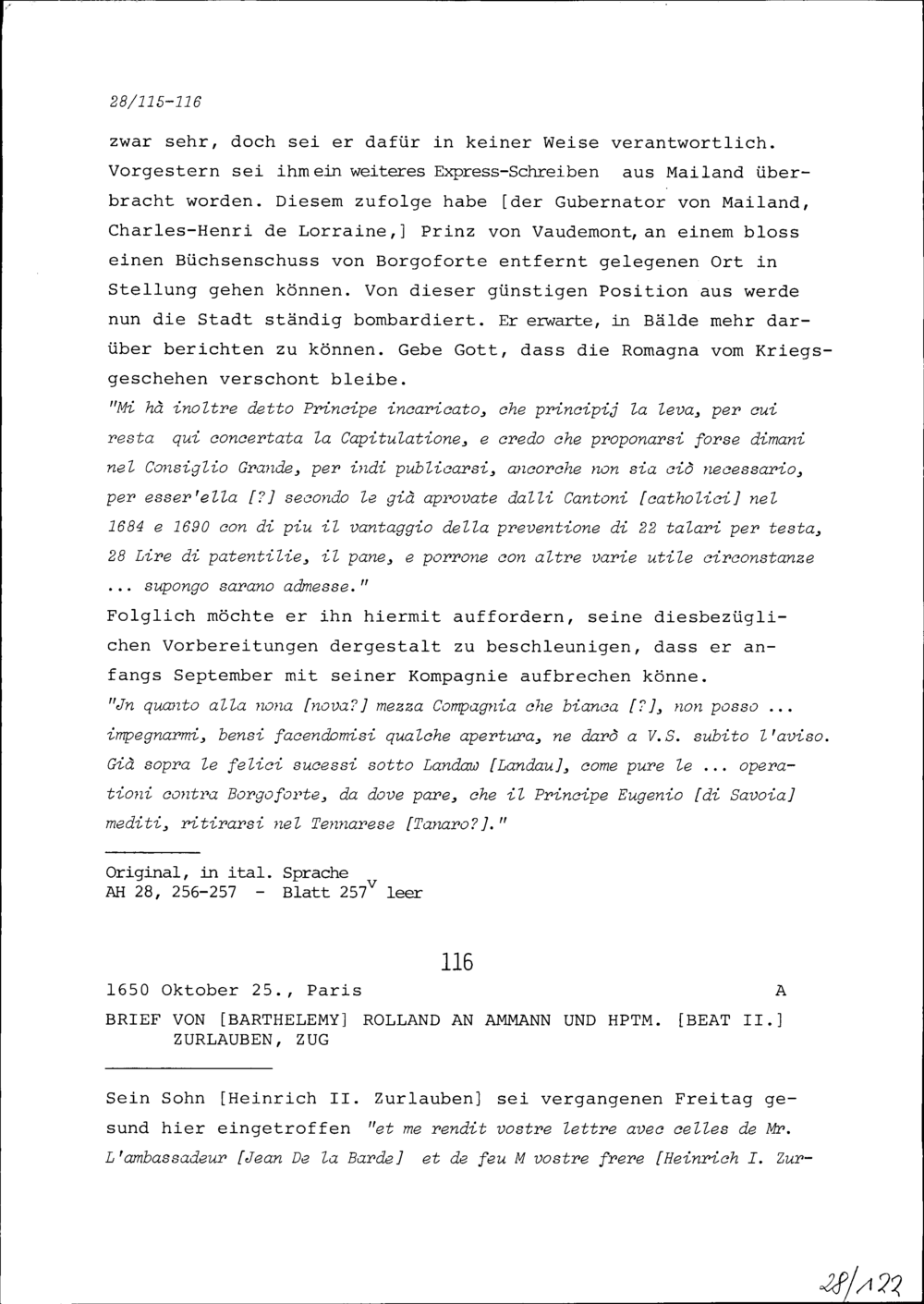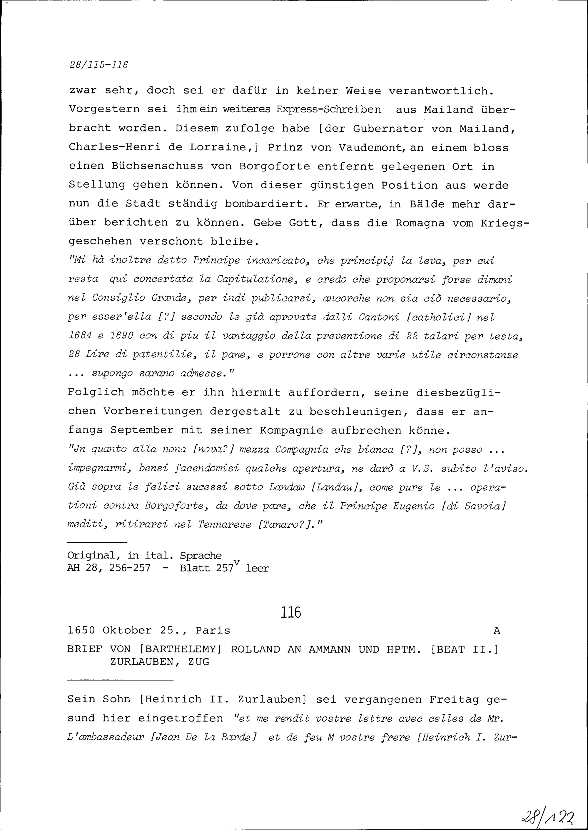 Schreiben von Barthélémy Rolland an Beat II. Zurlauben, Ammann und Hauptmann, Zu...