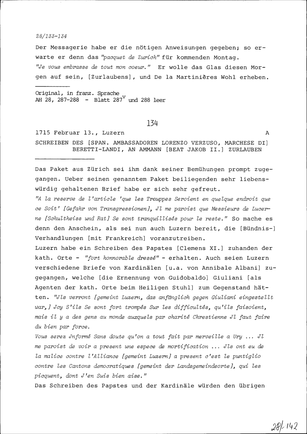 Schreiben von Lorenzo Verzuso, Marchese di Beretti-Landi, Ambassador von Spanien, an Beat Jakob II. Zurlauben, Ammann