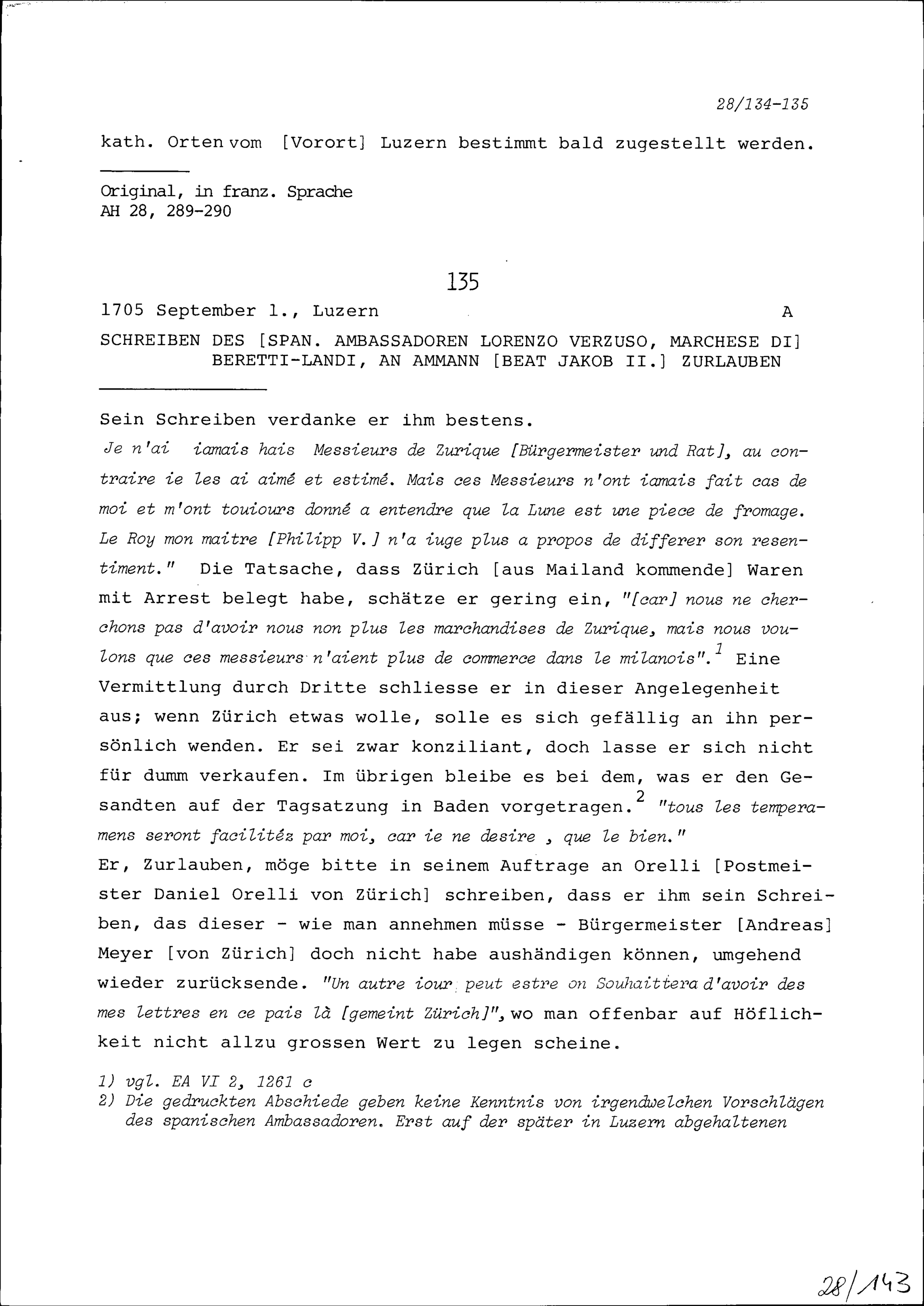Schreiben von Lorenzo Verzuso, Marchese di Beretti-Landi, Ambassador von Spanien, an Beat Jakob II. Zurlauben, Ammann