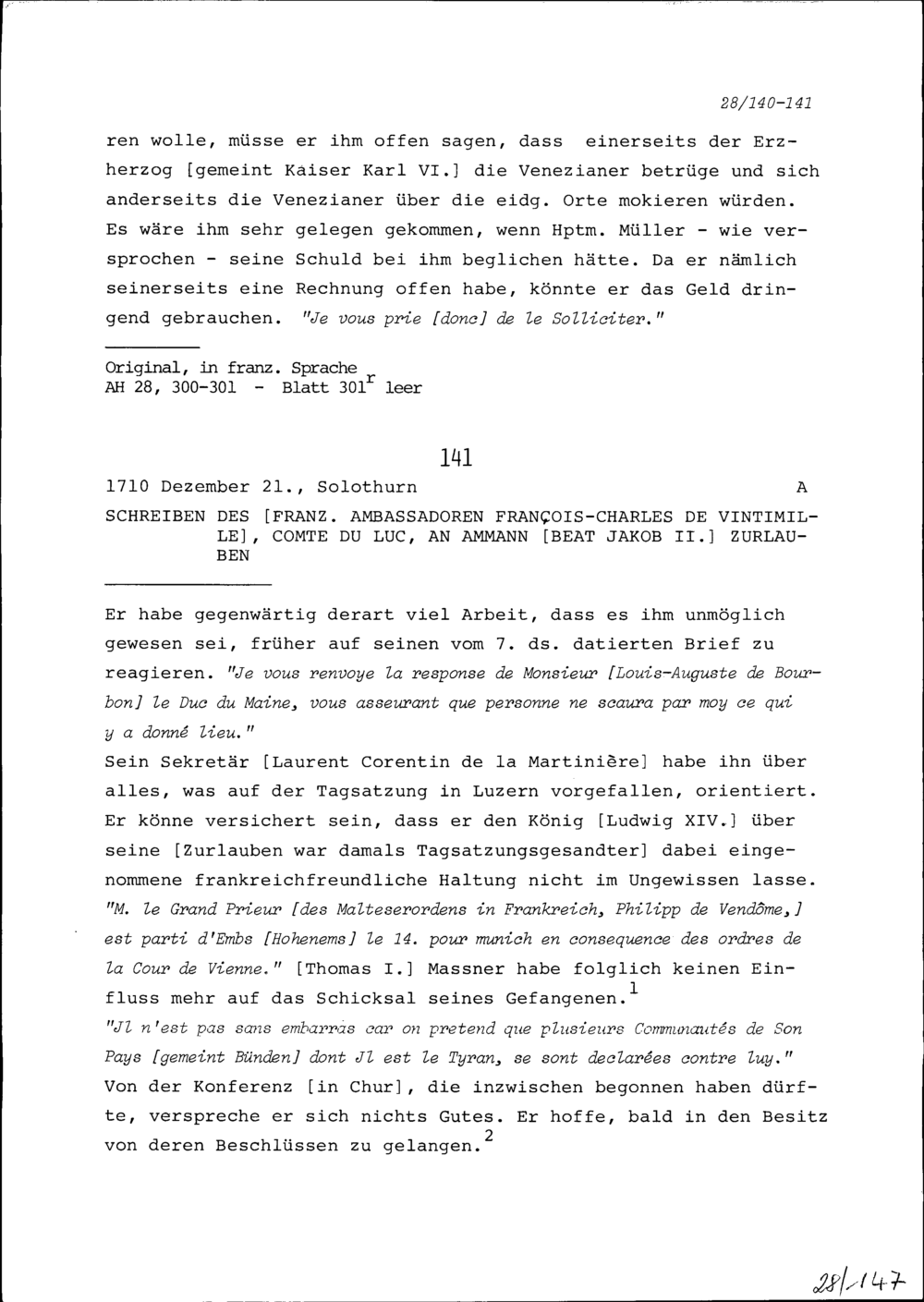 Schreiben von François-Charles de Vintimille, Graf du Luc, Ambassador von Frankreich, an Beat Jakob II. Zurlauben, Ammann
