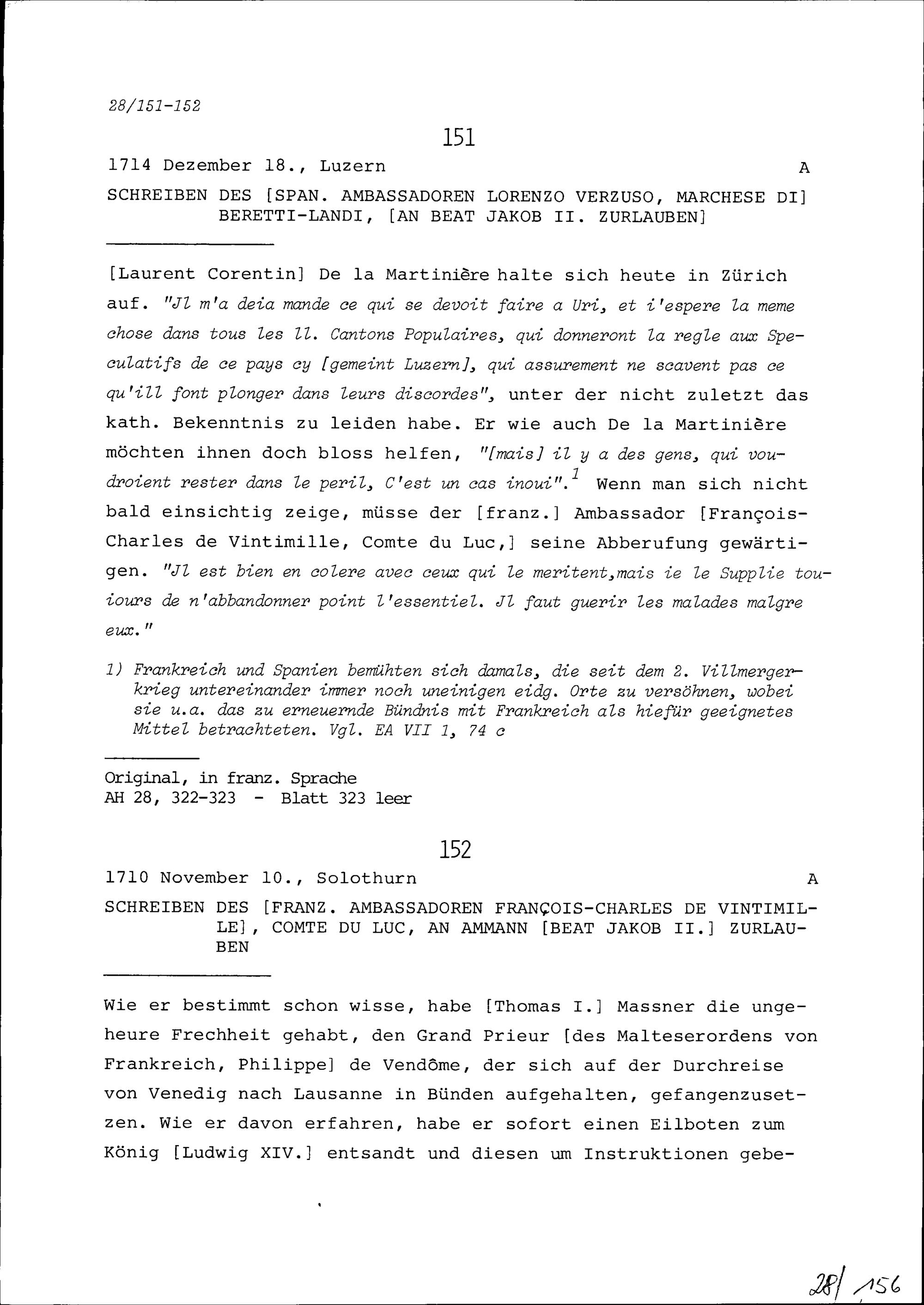 Schreiben von Lorenzo Verzuso, Marchese di Beretti-Landi, Ambassador von Spanien, an Beat Jakob II. Zurlauben