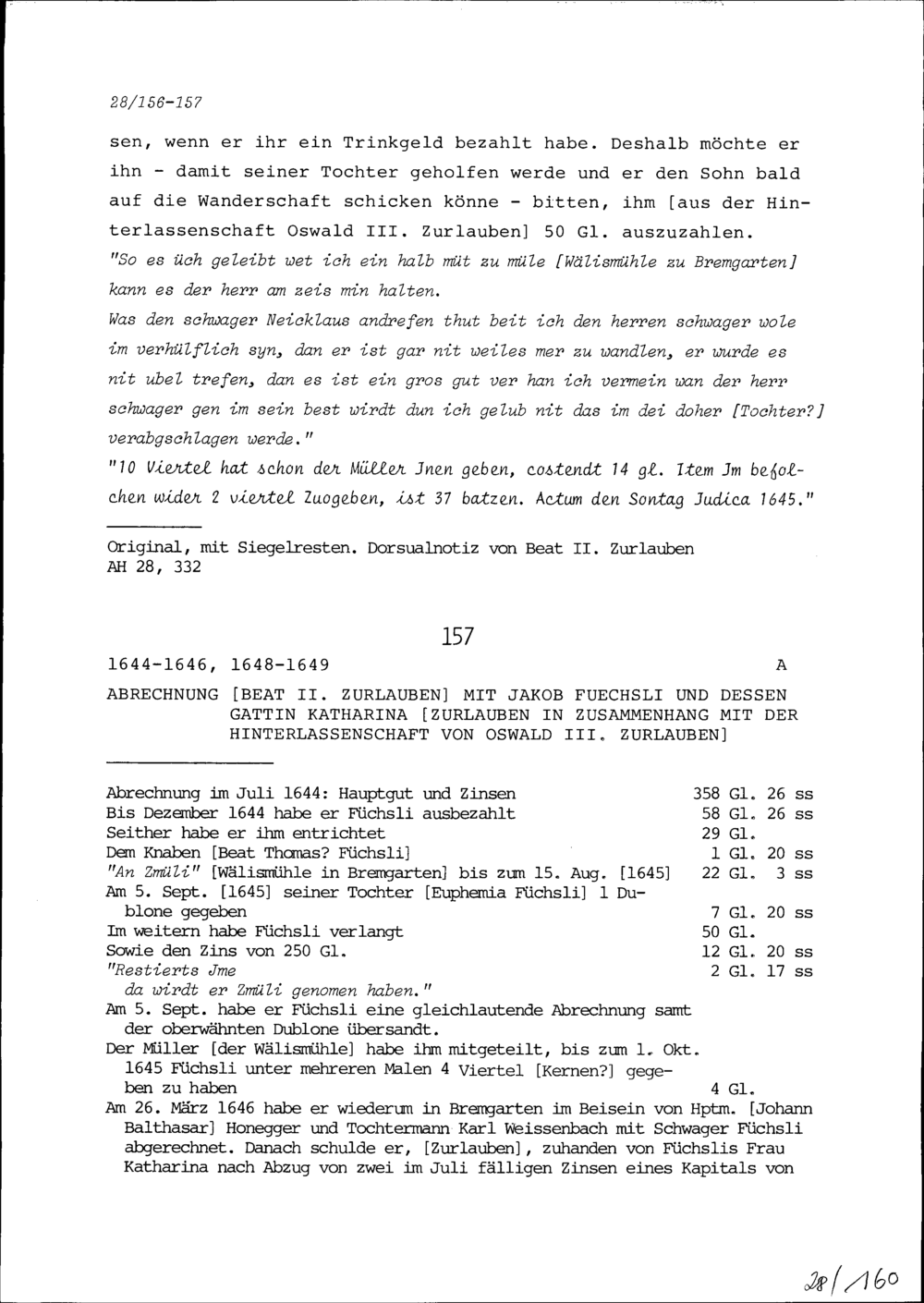 Abrechnung von Beat II. Zurlauben mit Jakob Füchsli und mit Katharina Zurlauben, dessen Gattin, in Zusammenhang mit der Hinterlassenschaft von Oswald III. Zurlauben