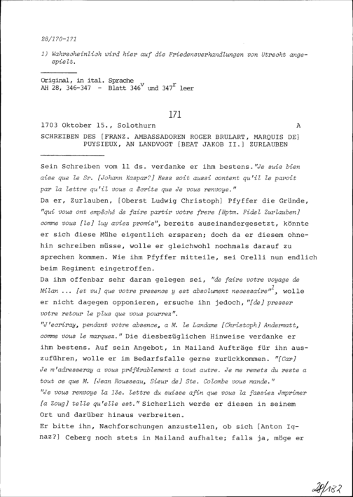 Schreiben von Roger Brûlart, Marquis de Puysieux, Ambassador von Frankreich, an Beat Jakob II. Zurlauben, Landvogt