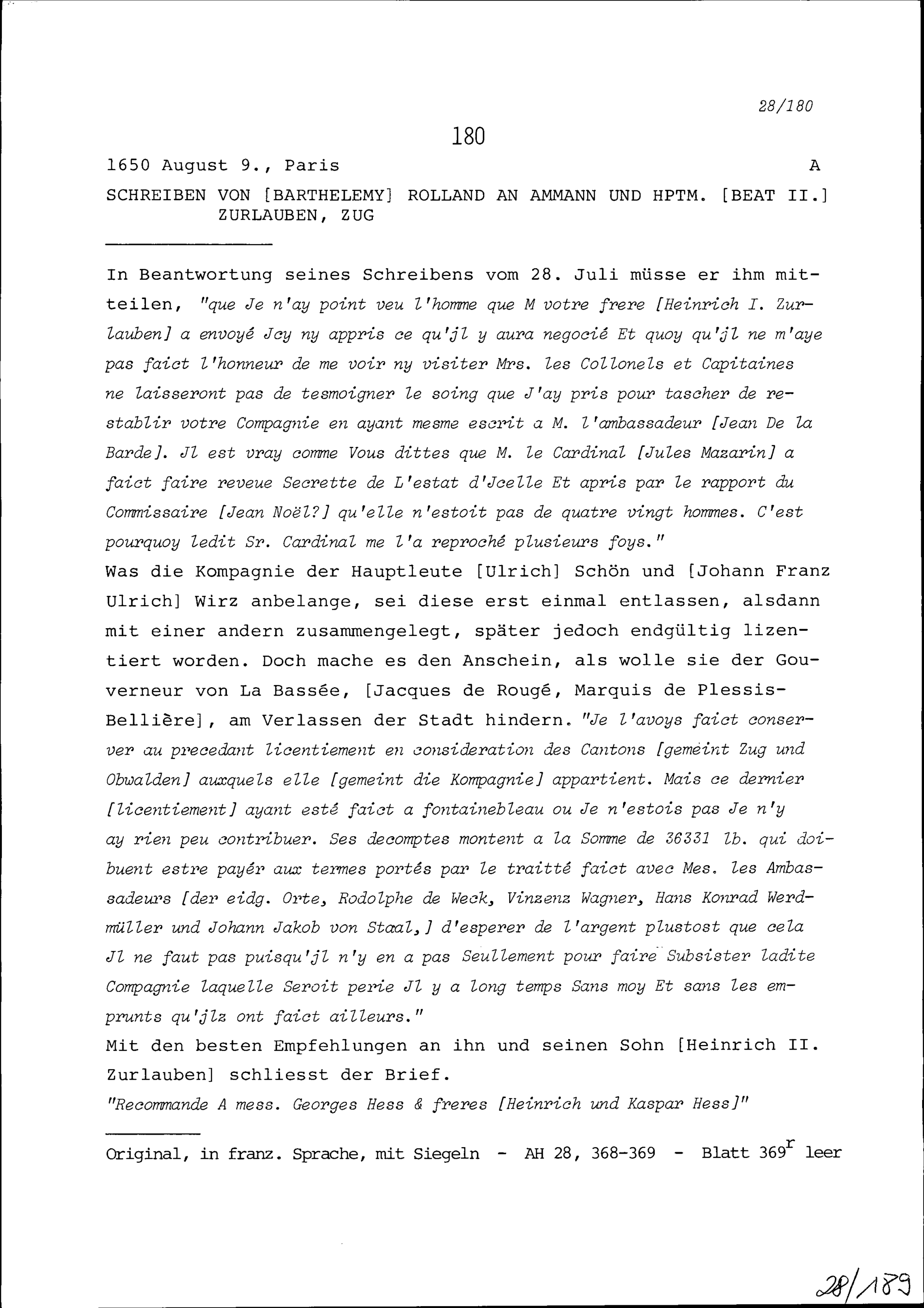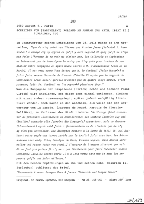 Schreiben von Barthélémy Rolland an Beat II. Zurlauben, Ammann und Hauptmann, Zu...