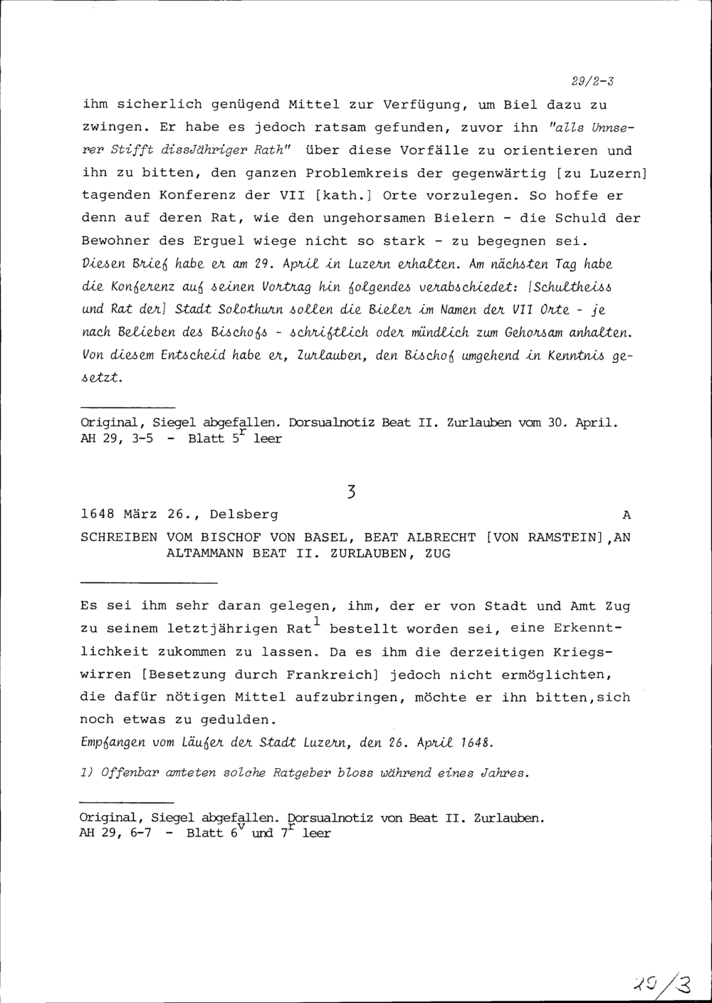 Schreiben von Beat Albrecht von Ramstein, Bischof von Basel, an Beat II. Zurlauben, Altammann, Zug