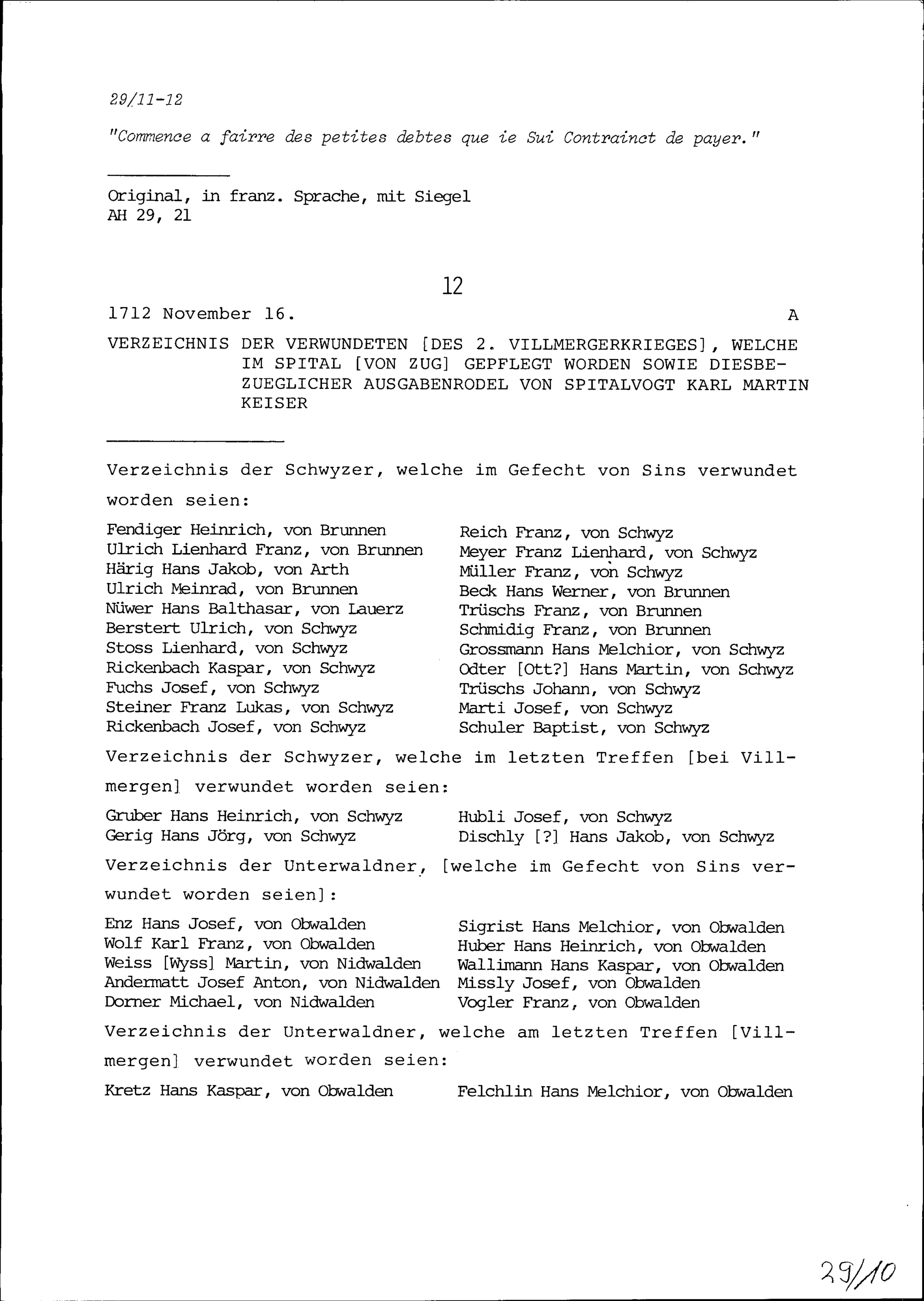 Verwundete des Zweiten Villmergerkriegs, welche im Spital von Zug gepflegt wurden, sowie diesbezüglicher Ausgabenrodel von Karl Martin Keiser, Spitalvogt