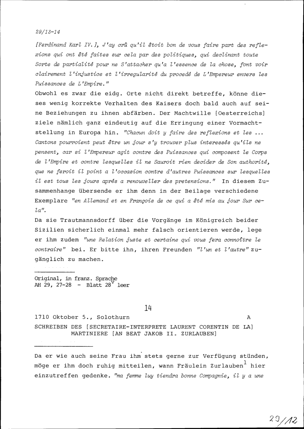 Schreiben von Laurent Corentin de la Martinière, Dolmetscher, an Beat Jakob II. ...