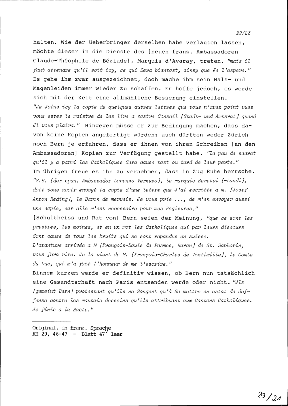 Schreiben von Laurent Corentin de la Martinière, französischer Geschäftsträger, an Beat Jakob II. Zurlauben, Ammann