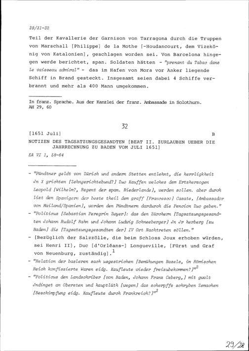 Notiz von Beat II. Zurlauben, Tagsatzungsgesandter, über die Jahrrechnung in Baden vom Juli 1651