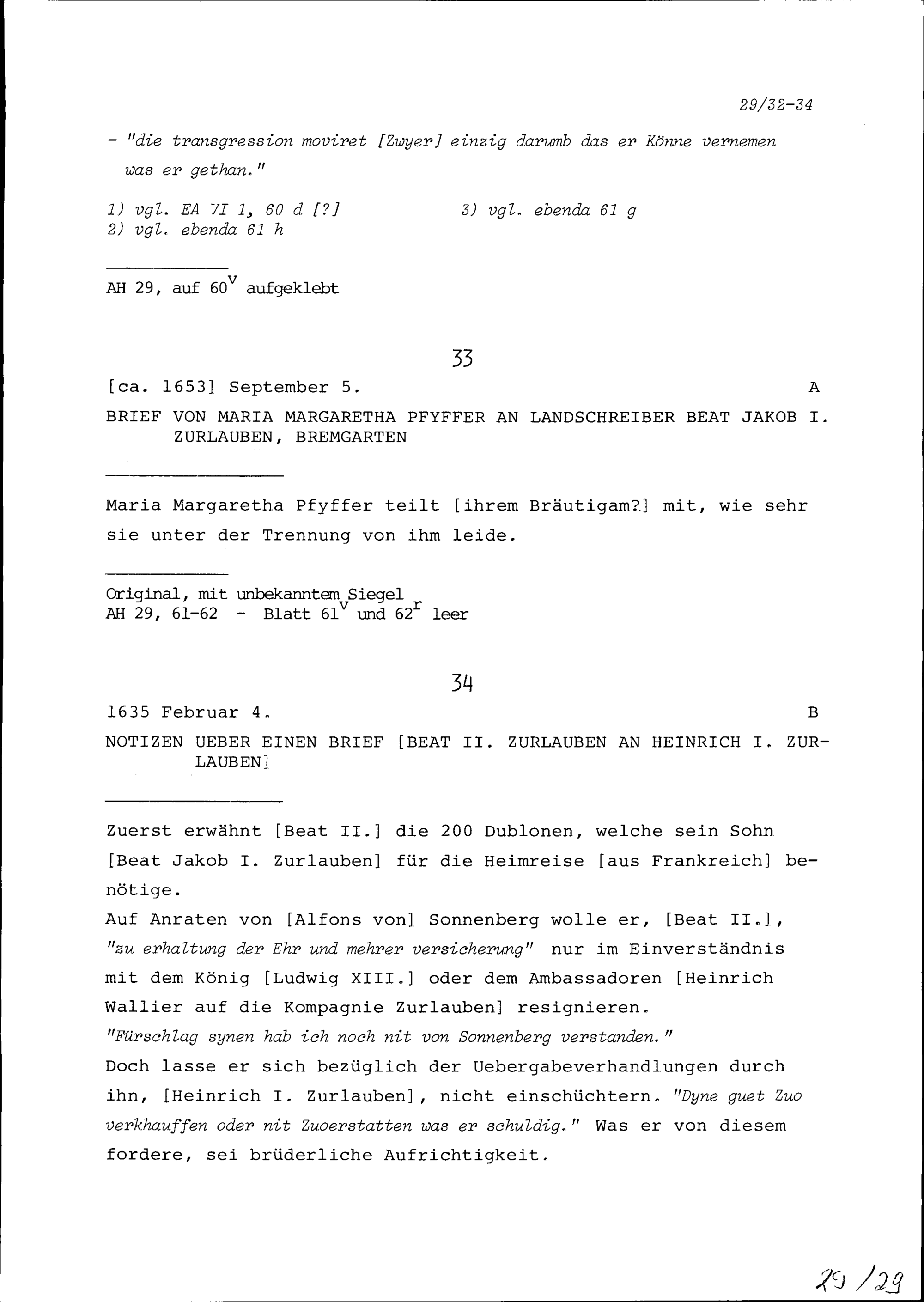 Schreiben von Maria Margaretha Pfyffer an Beat Jakob I. Zurlauben, Landschreiber, Bremgarten