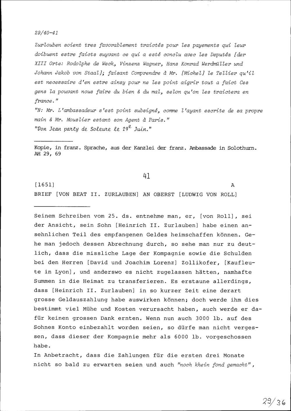 Schreiben von Beat II. Zurlauben an Ludwig von Roll, Oberst