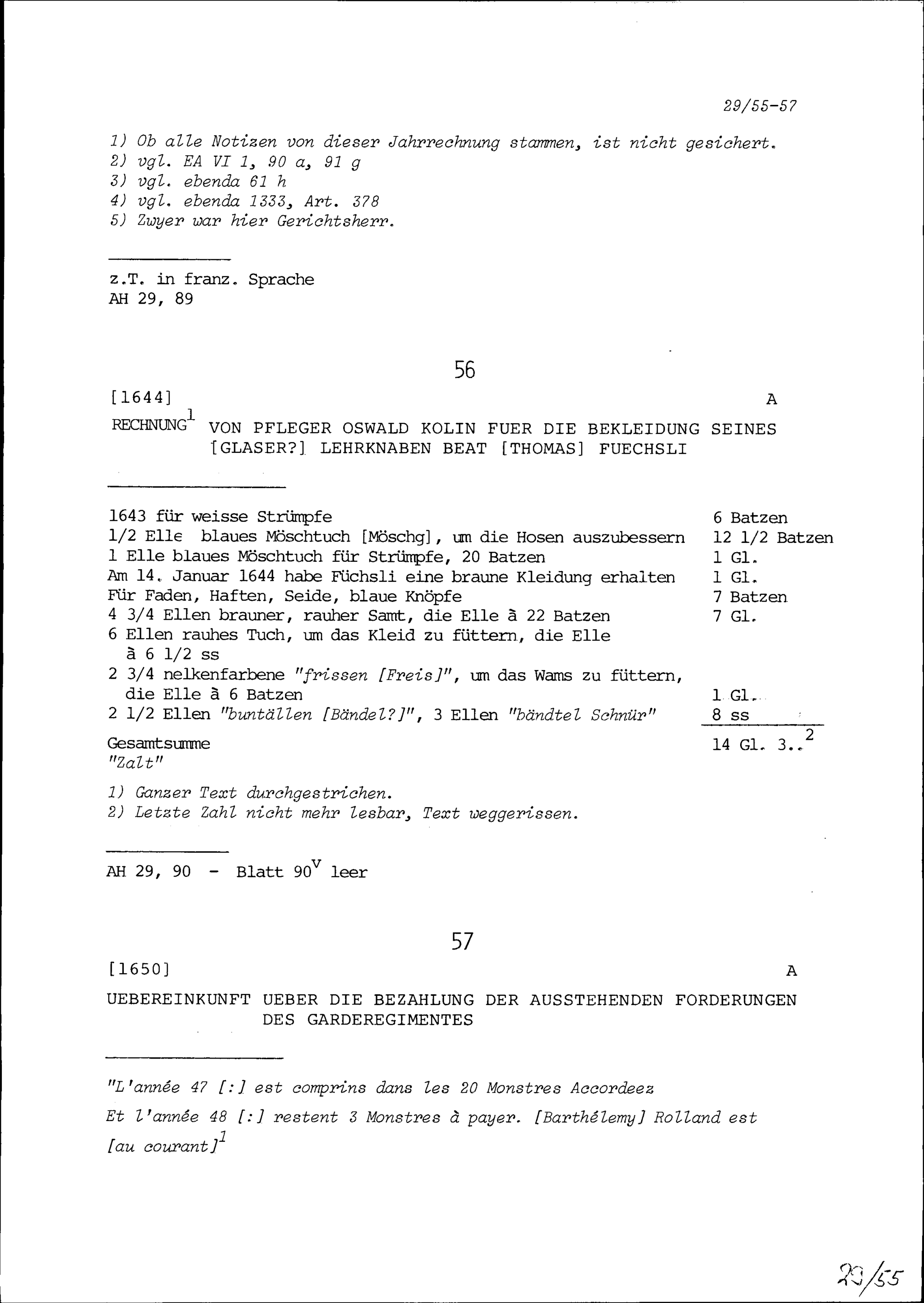 Rechnung von Oswald Kolin, Pfleger, für die Bekleidung von Beat Thomas Füchsli, Glaserlehring