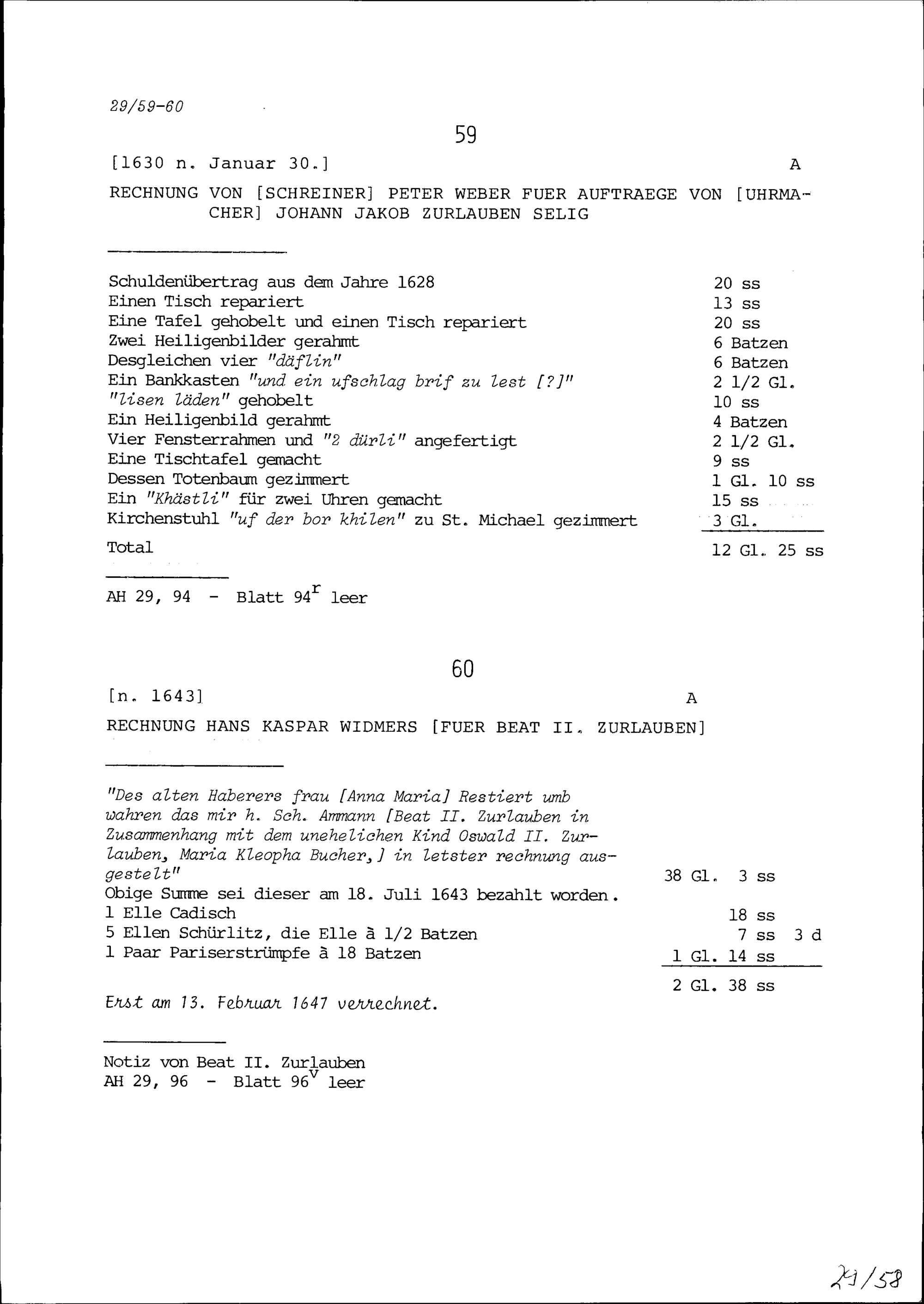 Rechnung von Peter Weber, Schreiner, für Aufträge von Johann Jakob Zurlauben, selig, Uhrmacher