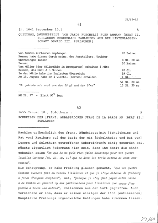 Quittung für Beat II. Zurlauben, Ammann, bezüglich Zahlungen aus der Hinterlassenschaft...