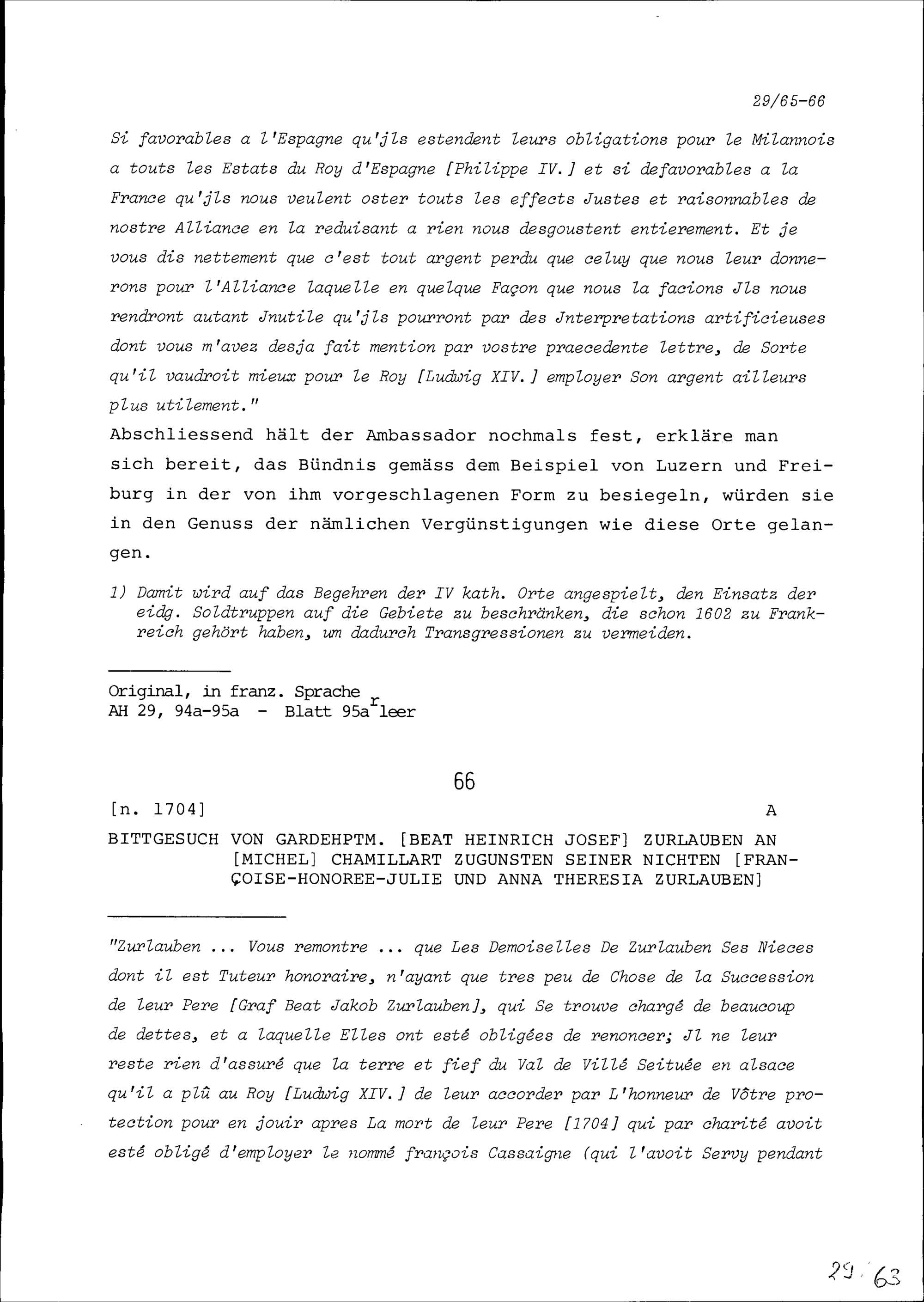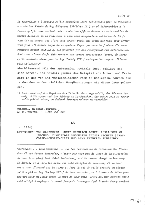 Bittgesuch von Beat Heinrich Josef Zurlauben, Gardehauptmann, an Michel Chamillart zugunsten seiner Nichten Françoise-Honorée-Julie Zurlauben und Anna Theresia Zurlauben