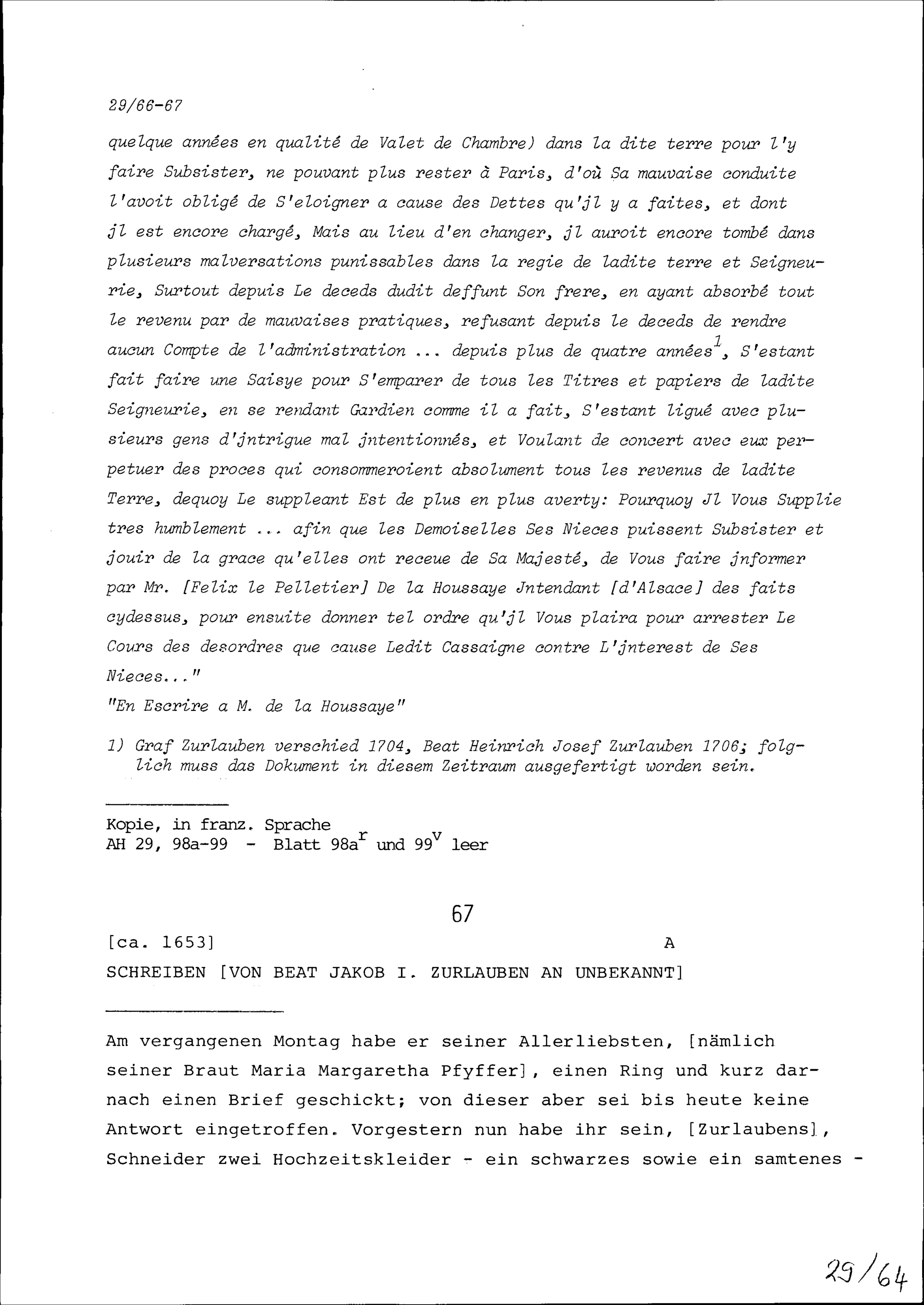 Schreiben von Beat Jakob I. Zurlauben an Unbekannt