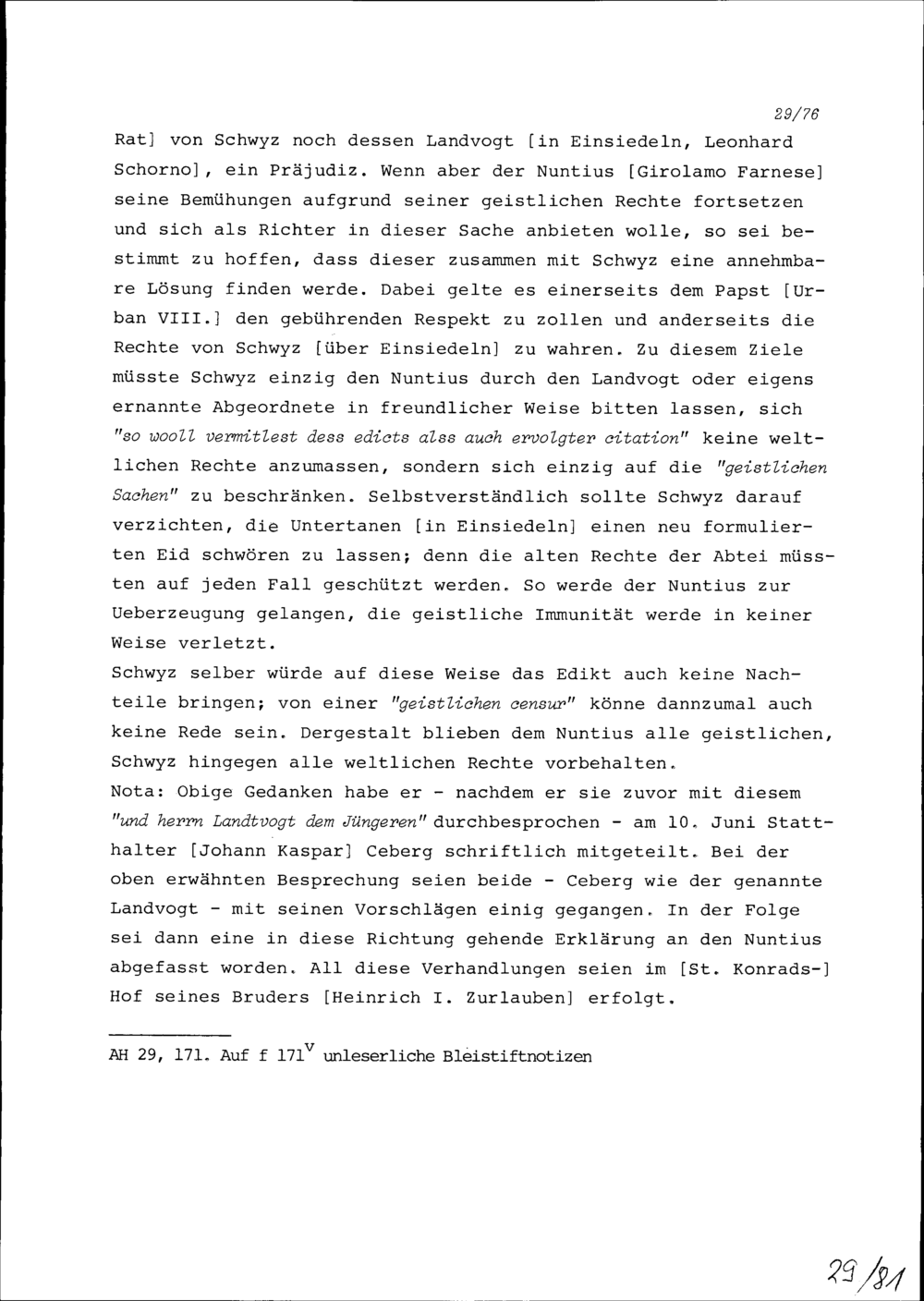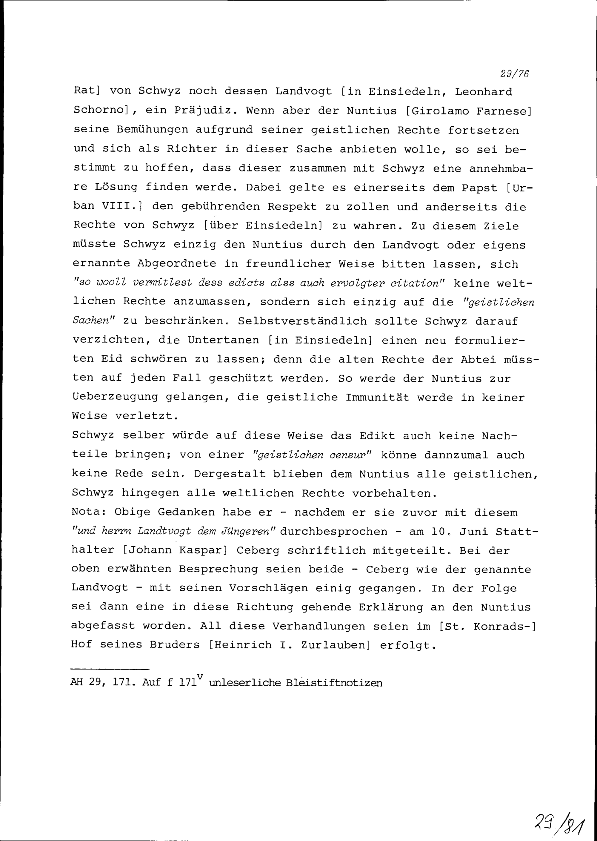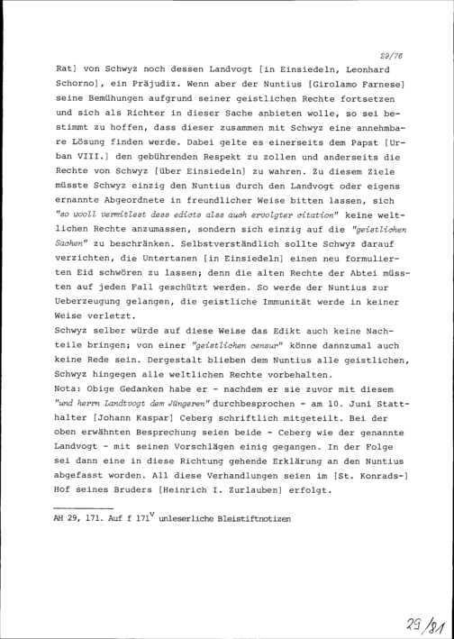 Notiz von Beat II. Zurlauben über die Streitigkeiten zwischen Schwyz und der Abtei Einsiedeln