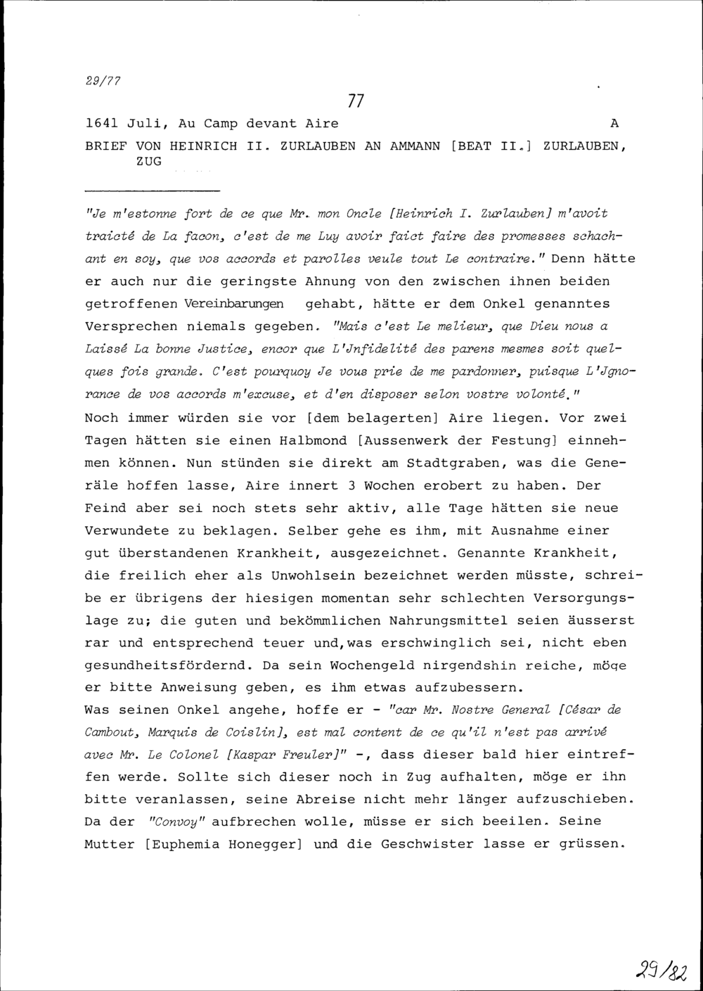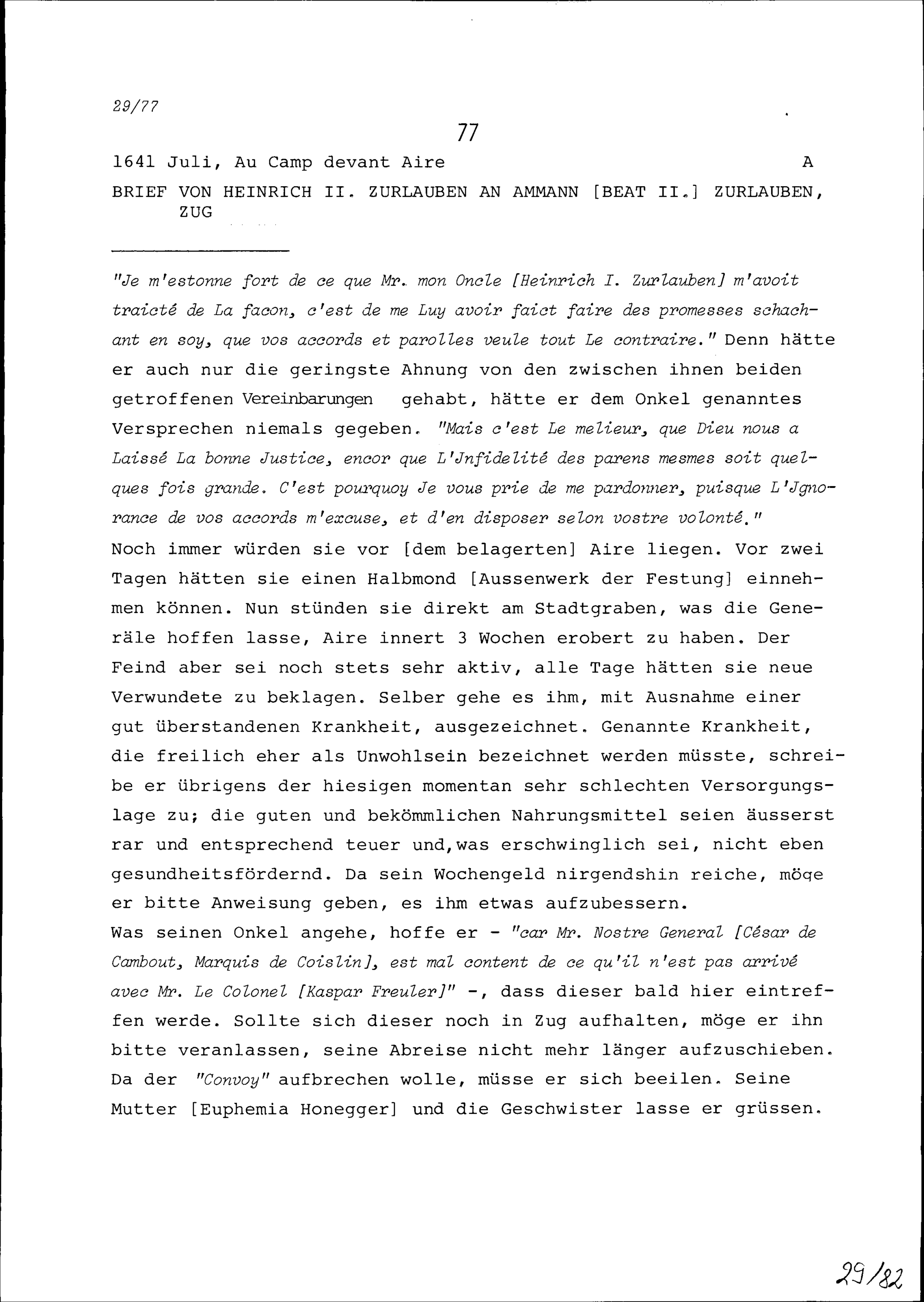 Schreiben von Heinrich II. Zurlauben an Beat II. Zurlauben, Ammann, Zug