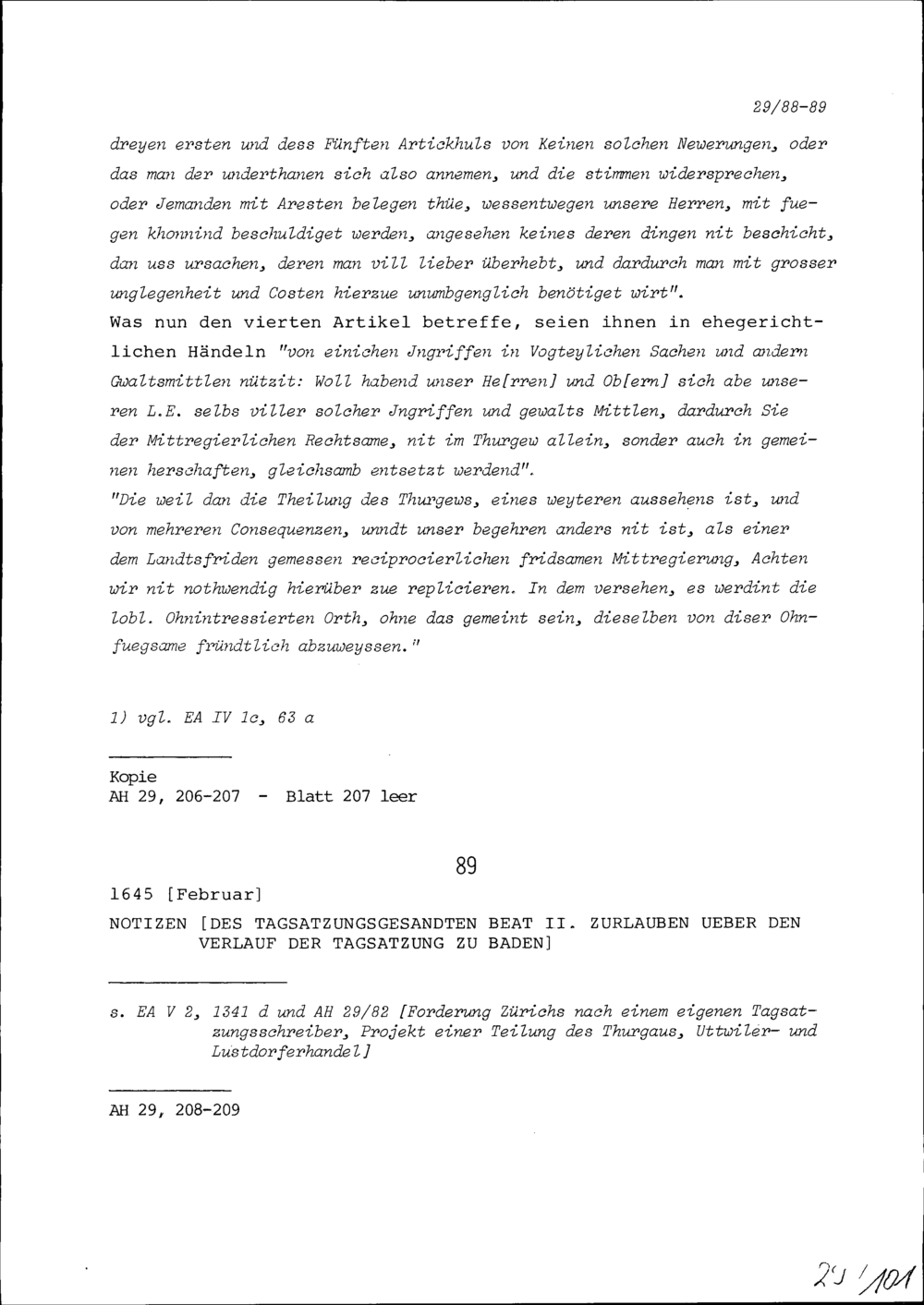 Notiz von Beat II. Zurlauben, Tagsatzungsgesandter, über den Verlauf der Tagsatzung...