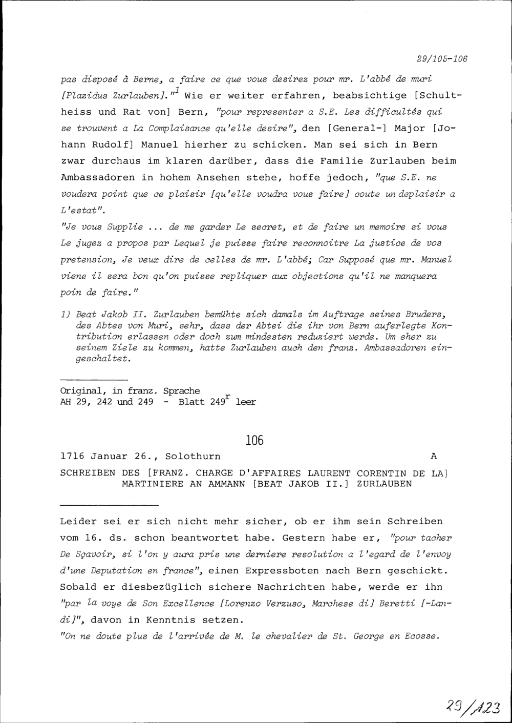 Schreiben von Laurent Corentin de la Martinière, französischer Geschäftsträger, an Beat Jakob II. Zurlauben, Ammann