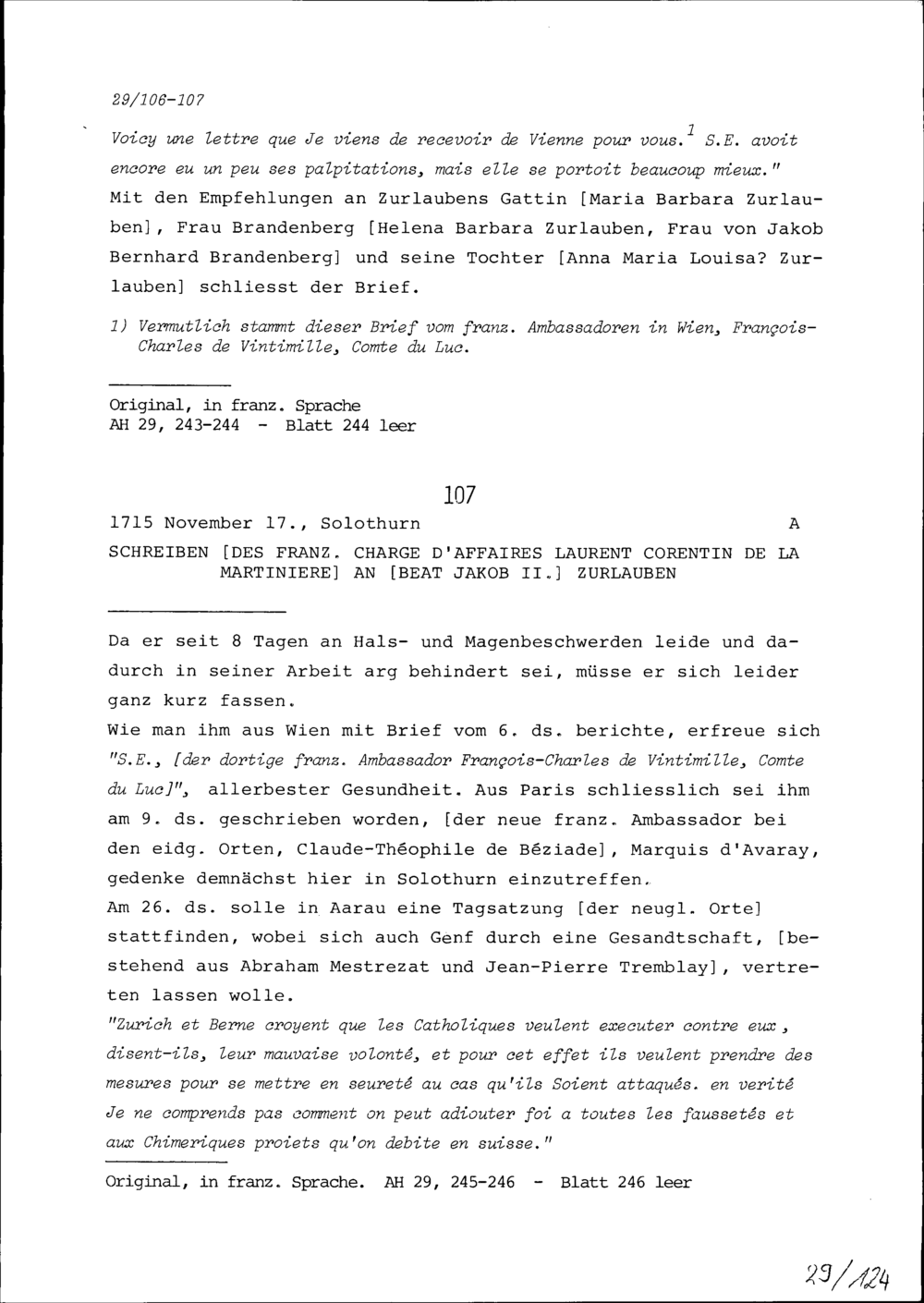 Schreiben von Laurent Corentin de la Martinière, französischer Geschäftsträger, an Beat Jakob II. Zurlauben