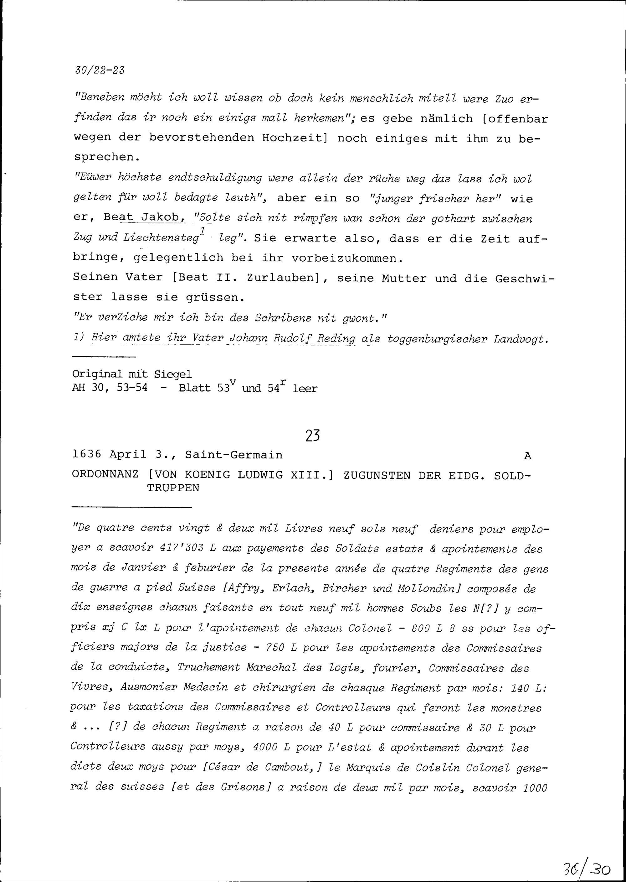 Ordonnanz von Ludwig XIII., König von Frankreich, zugunsten der eidgenössischen Soldtruppen