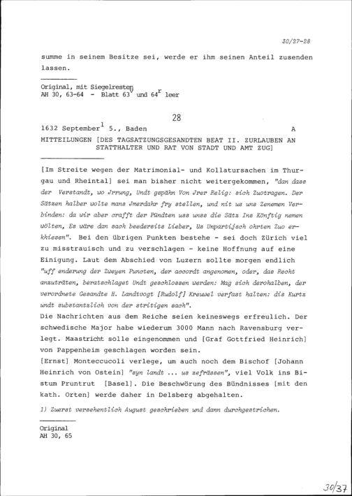 Mitteilungen von Beat II. Zurlauben, Tagsatzungsgesandter, an Statthalter und Rat...