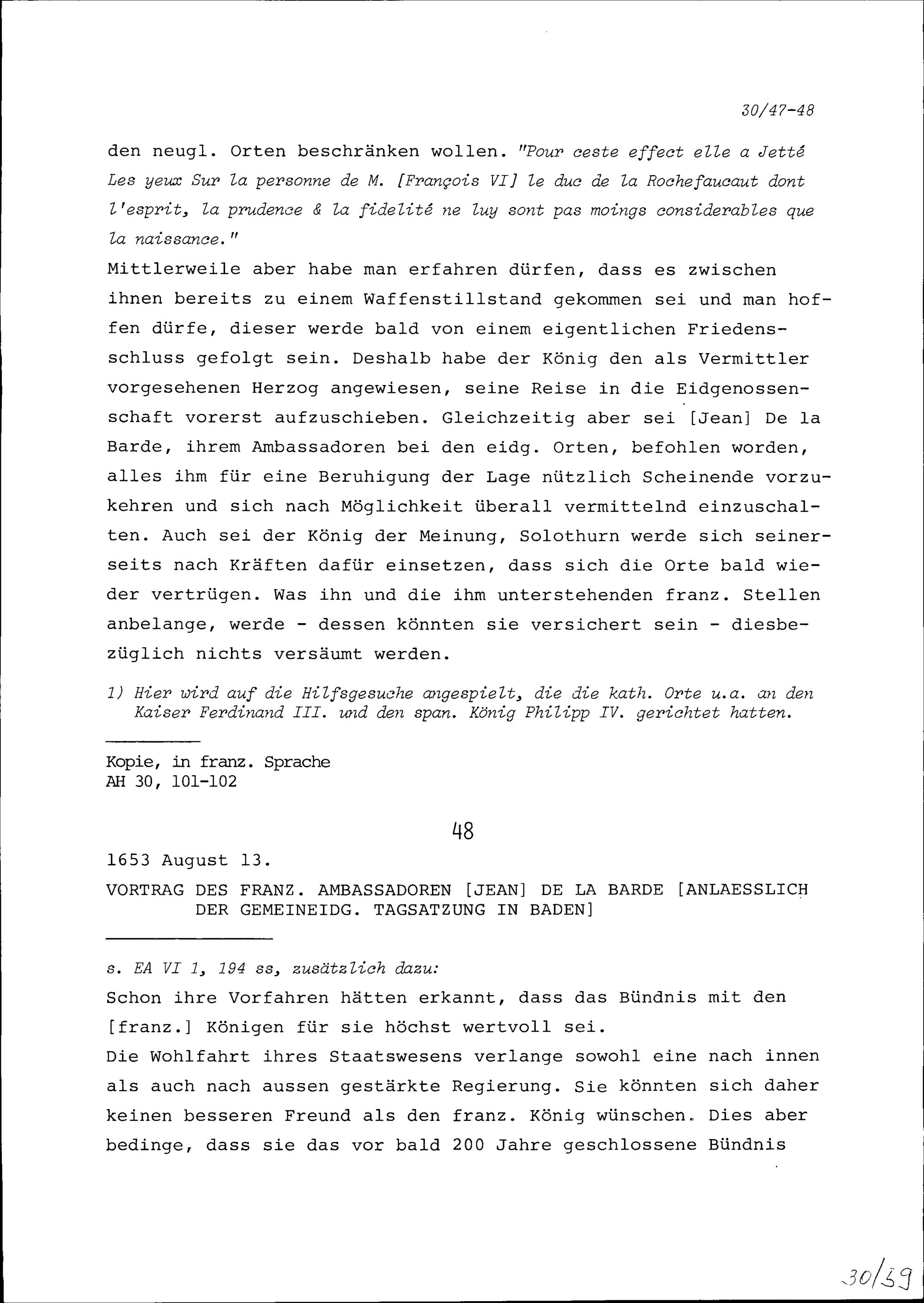Vortrag von Jean de la Barde, Ambassador von Frankreich, anlässlich der Tagsatzung in Baden
