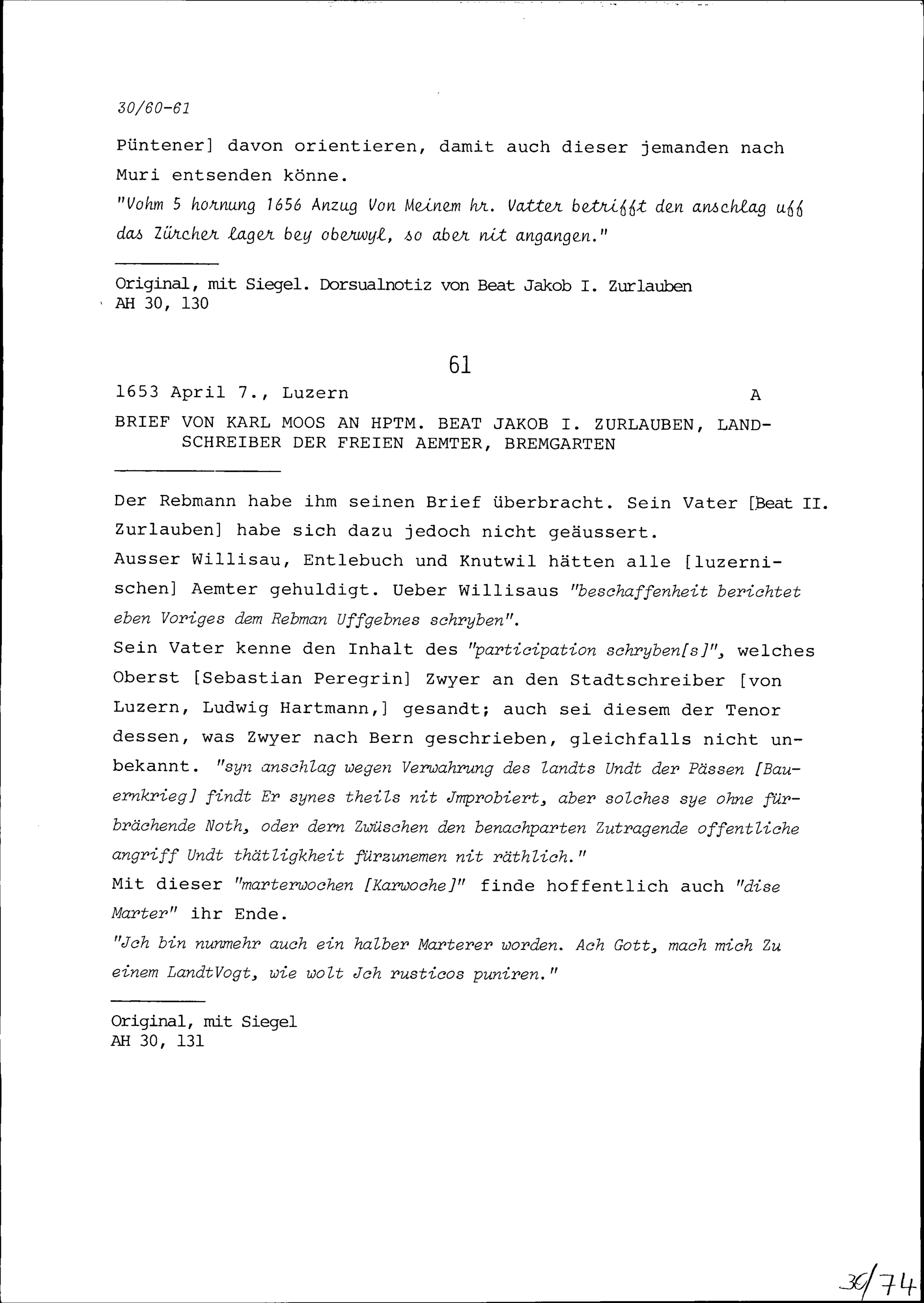 Schreiben von Karl Moos an Beat Jakob I. Zurlauben, Hauptmann und Landschreiber der Freien Ämter, Bremgarten