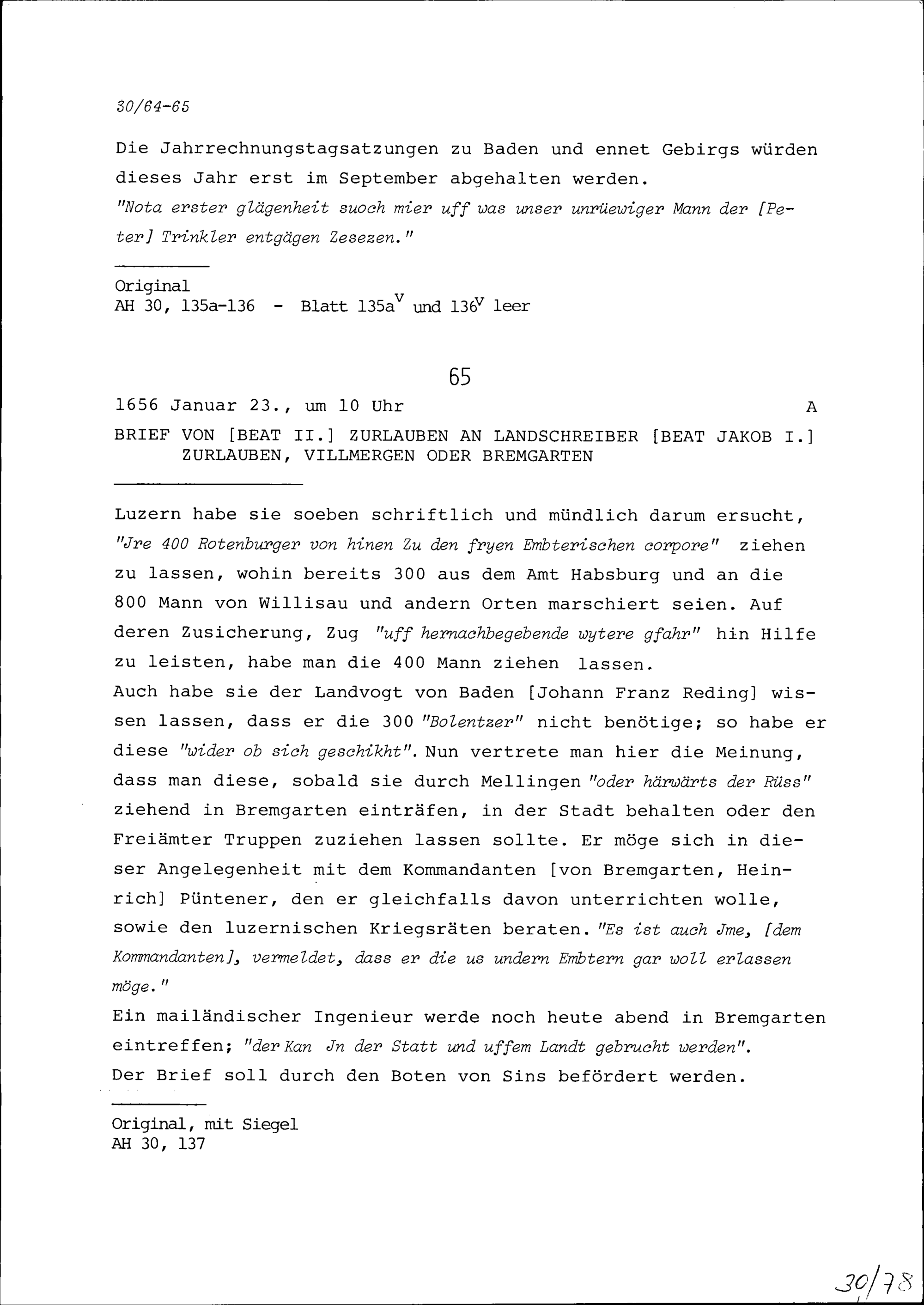 Schreiben von Beat II. Zurlauben an Beat Jakob I. Zurlauben, Landschreiber, Villmergen...