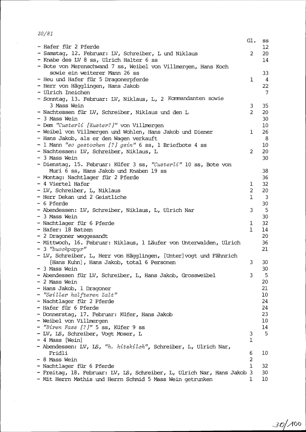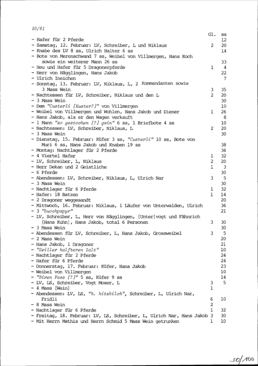 Rechnung von Johann Melchior Kyd für Jakob Wirz, Landvogt der Freien Ämter, in der Zeit des Ersten Villmergerkriegs