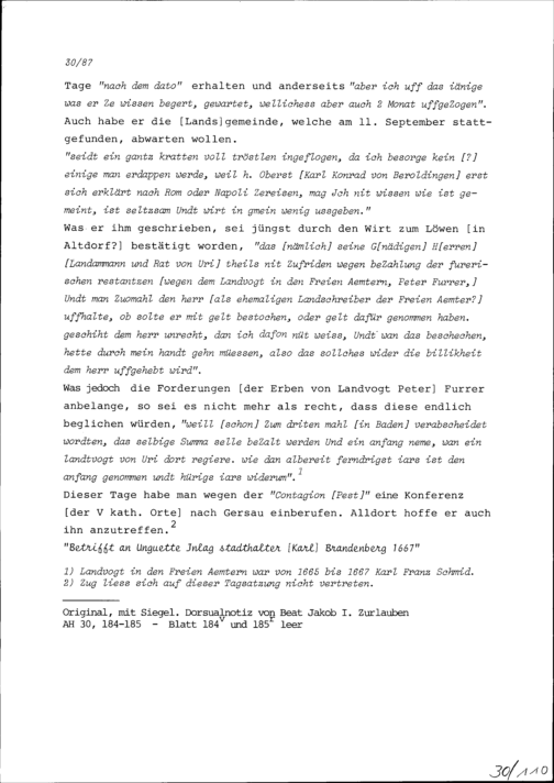 Schreiben von Karl Franz Schmid an Beat Jakob I. Zurlauben, Hauptmann und Rat, Z...