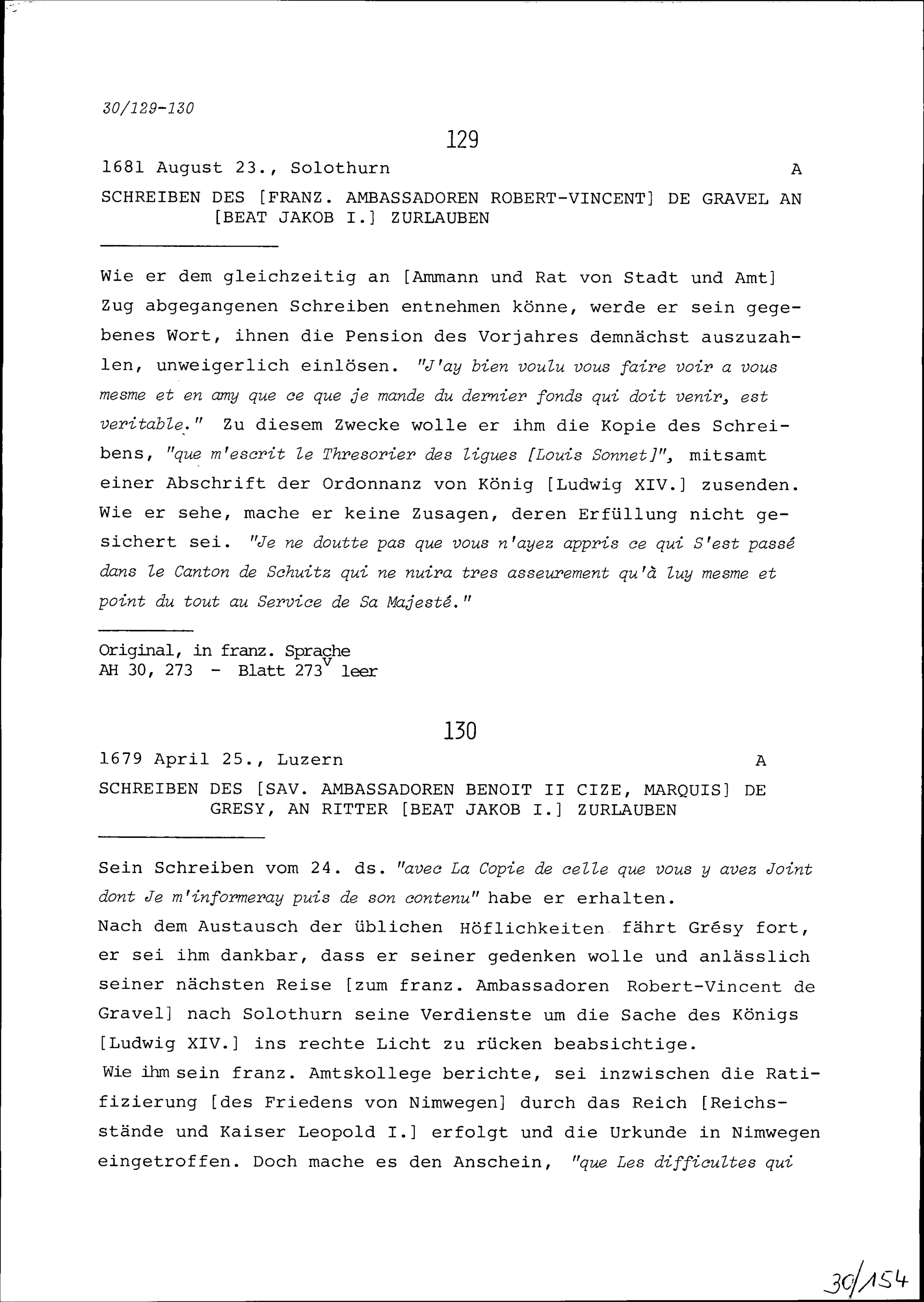 Schreiben von Robert-Vincent de Gravel, Ambassador von Frankreich, an Beat Jakob I. Zurlauben