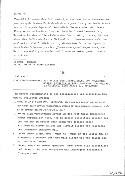 Kundschaftsaufnahme aus Anlass der Inhaftierung von Johann Heinrich Keller, Musketier, angeordnet von Beat Jakob II. Zurlauben, Landvogt im Thurgau