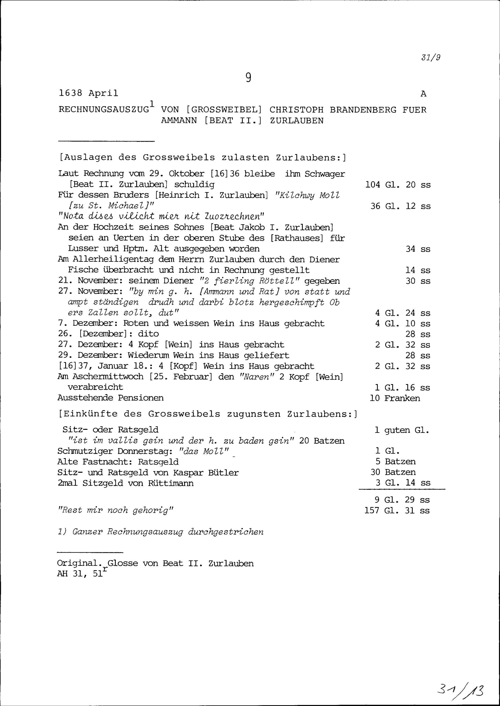 Rechnungsauszug von Christoph Brandenberg, Grossweibel, für Beat II. Zurlauben, Ammann