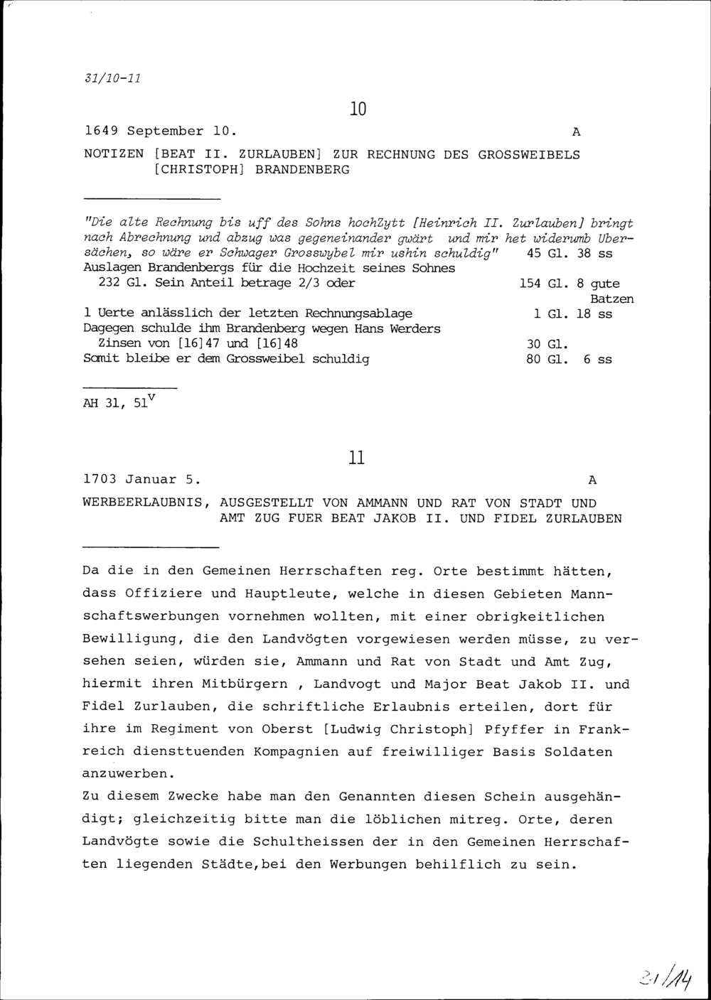 Notiz von Beat II. Zurlauben zur Rechnung von Christoph Brandenberg, Grossweibel