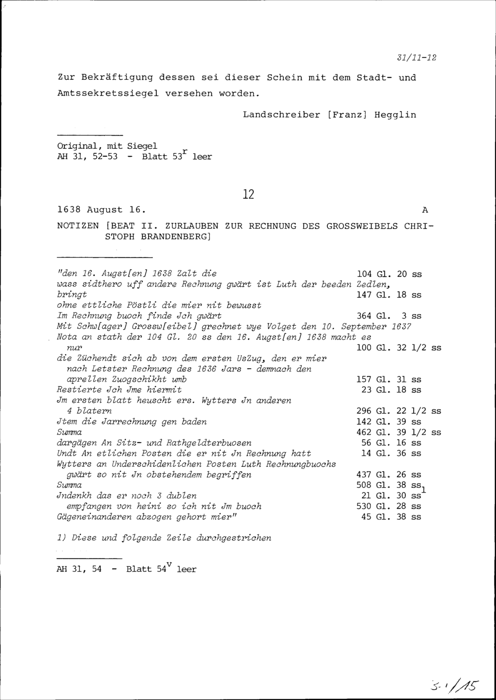 Notiz von Beat II. Zurlauben zur Rechnung von Christoph Brandenberg, Grossweibel