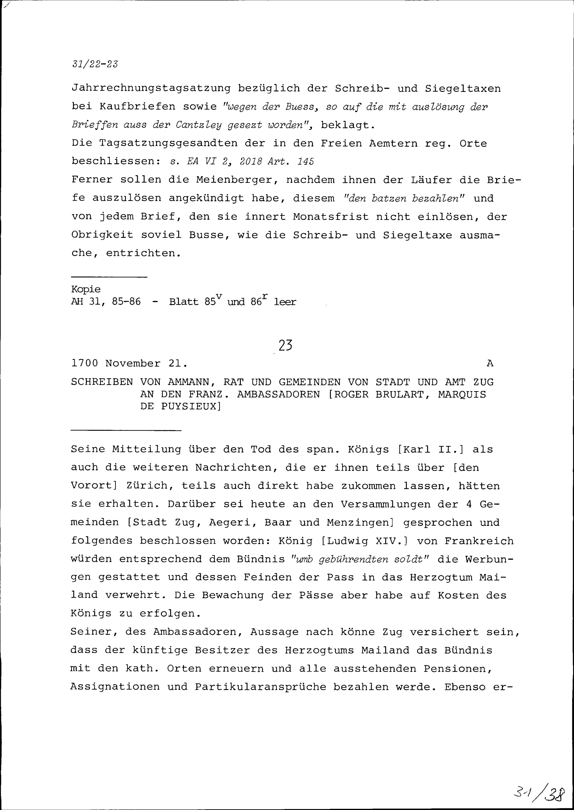 Schreiben des Ammanns, Rats und der Gemeinden von Stadt und Amt Zug an Roger Brûlart, Marquis de Puysieux, Ambassador von Frankreich